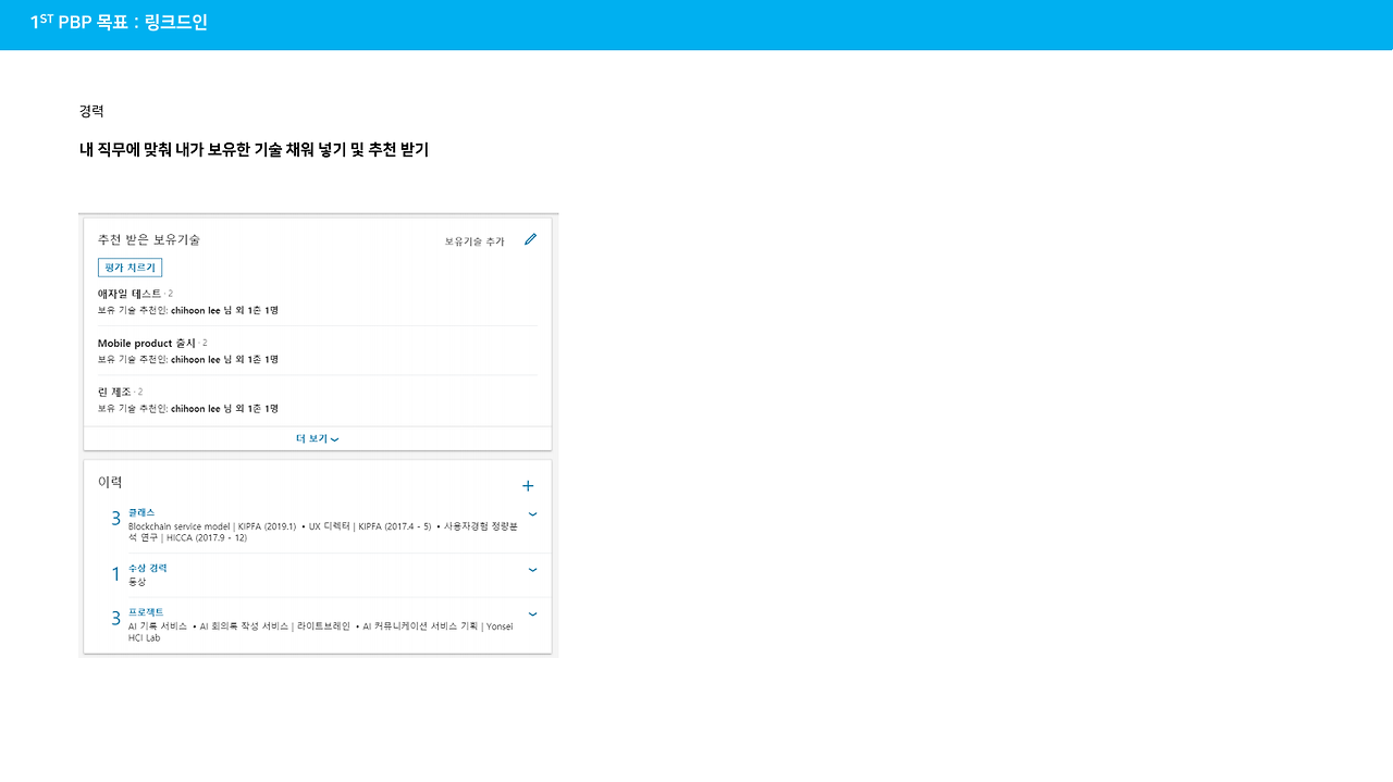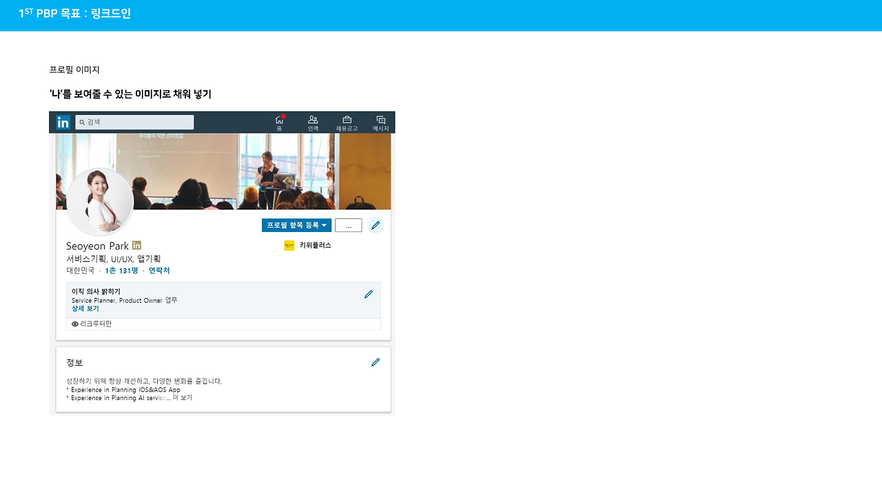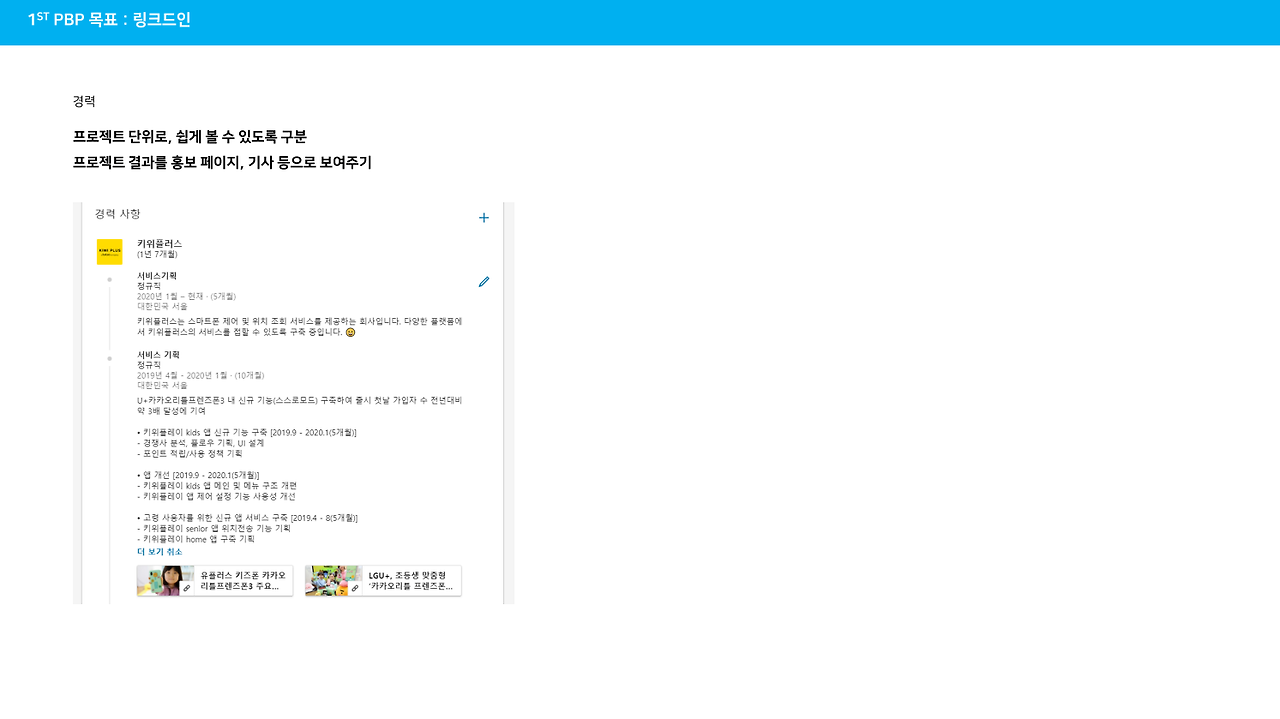 : 서연님은 PBP 1기에서 이력과 링크드인을 완성하는 것이 목표였습니다. 서연님과의 예전부터 인연이 있었지만 이번 서연님의 이력을 보면서 '카카오 리틀 프렌즈폰'을 만든 장본인이 서연님이라는 것을 처음 알았습니다.