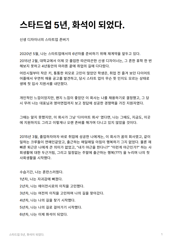 : 재은님은 PBP 1기에서 한 스타트업에서 시니어 디자이너 없이 인하우스 디자이너로서의 성장과정을 브런치를 통해 공유하는 것이 목표였습니다. 재은님이 아직 브런치 작가가 아니기 때문에 성장과정에 대한 글과 브런치 작가 승인 절차를 동시에 진행하였습니다. 글은 사전에 노션에 정리를 하였으나 아쉽게도 1기를 진행하는 기간 동안 작가 승인이 떨어지지 않은 관계로 많은 분들에게 재은님의 성장과정을 보여드리진 못하게 되었습니다. 저는 사전에 노션에 정리된 것을 보았는데 무척이나 흥미로웠고 이 글을 보고 계신 디자이너라면 앞으로 재은님이 써내려가는 글에 많은 공감과 재미를 느끼실 것이라 생각됩니다. 앞으로 임팩트 있는 브런치 작가가 될 재은님의 글을 살짝 공개합니다 :)