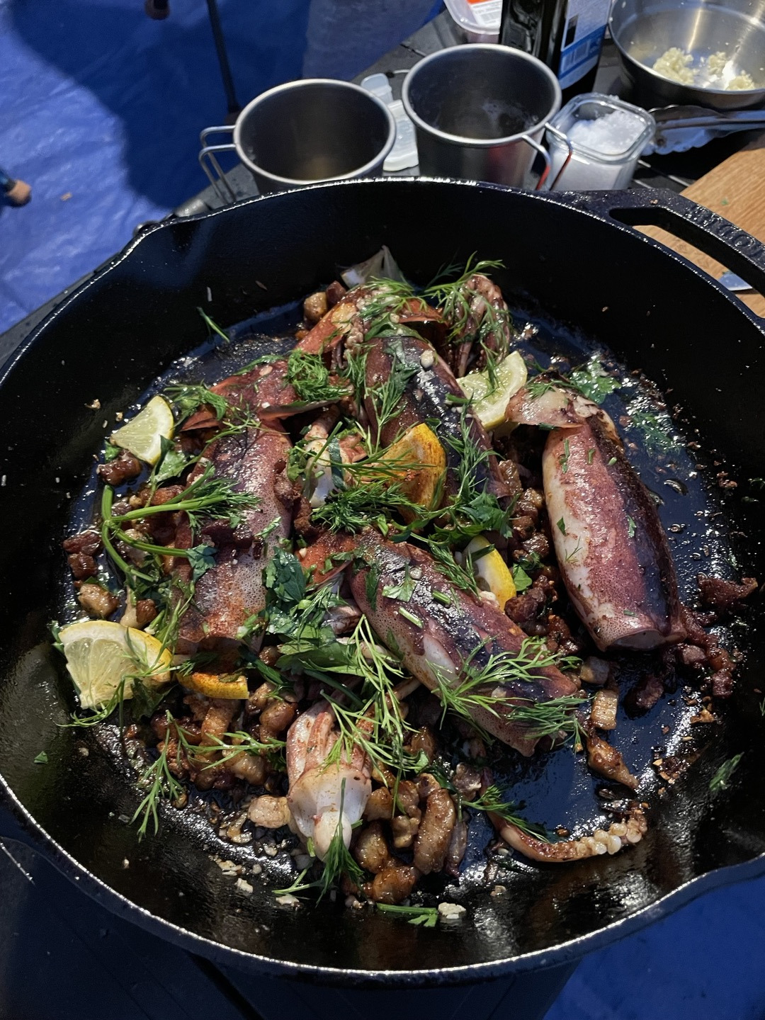 야들야들한 오징어의 식감, 쫄깃 바삭 고소한 삼겹살과 지방의 조화, 그리고 파세리와 딜이 깔끔함을 더했다.
