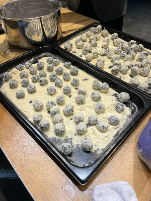 재료가 준비가 되면, 리코타치즈와 파르미지아노 레지아노, 페코리노 로마노, 데친 적근대, 소금, 후추를 넣고 잘 섞어 준다. 그리고 방울토마토 크기의 경단으로 만든 후 세몰리나 (Semolina)에 굴린 후 냉장고에 30분 정도 넣어 놓았다 약간 단단해지면 다시 손으로 굴려 모양을 잡아 준다.