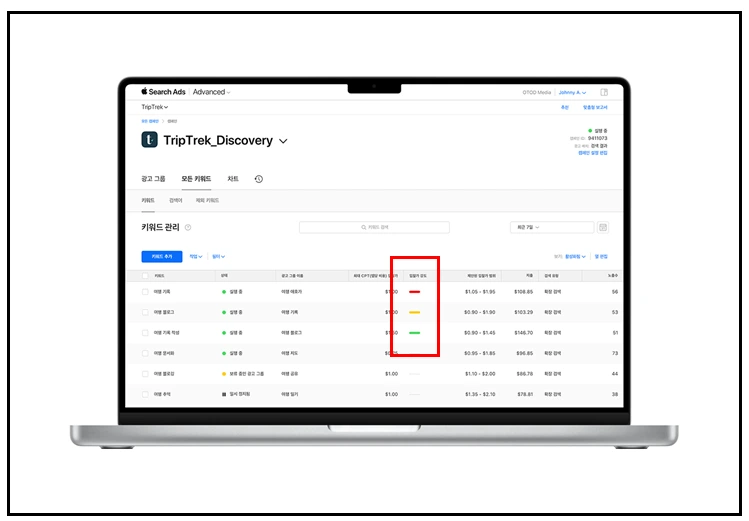 키워드를 세팅하게 되면 옆으로 초록, 주황, 빨강의 바를 확인할 수 있다. 해당 바는 키워드의 적정 입찰가를 표시해 주는 요소이다. 초록은 평균 입찰가보다 높은 상태, 주황은 평균 입찰가, 빨강은 평균 입찰가보다 낮은 상태임을 뜻한다. 이것을 바탕으로 성과가 떨어진다면 조정해 볼 수 있겠다.