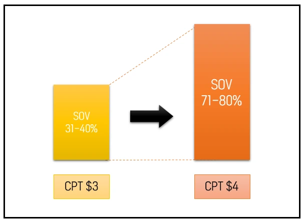 SOV는 해당 키워드의 광고 점유율을 의미한다. 입찰가를 조정할 하나의 지표로 볼 수 있다. 현재 입찰가가 $3에 SOV 31-40% 라면 $4로 조정하여 SOV 71-80%를 달성하는 것이다. 마케팅 목표가 인지도 확보라면 SOV를 높이기 위해 입찰가를 조정해 보아도 좋을 것이다. (구글 검색광고의 상단 노출 점유율과 비슷한 개념이라 생각된다.)