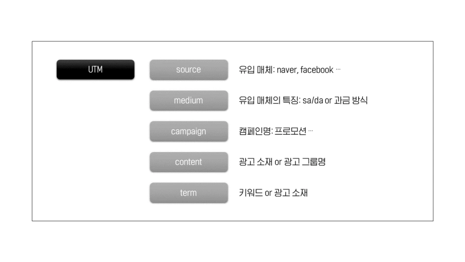 매개 변수로는 source, medium, campaign, content, term으로 5가지가 있다. 우리는 정확한 데이터 분석을 위해 각 매개 변수의 의미를 분명하게 이해하고 사용하는 것이 중요하다. (혹, utm을 부적절하게 붙이게 될 경우 깊은 혼란을 야기할 수 있다.)
