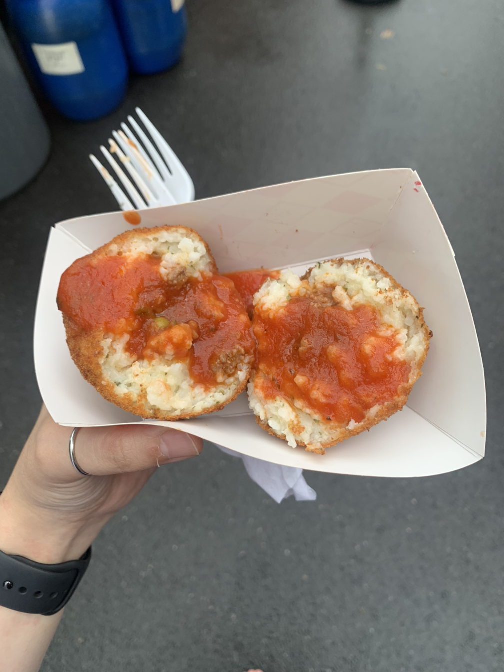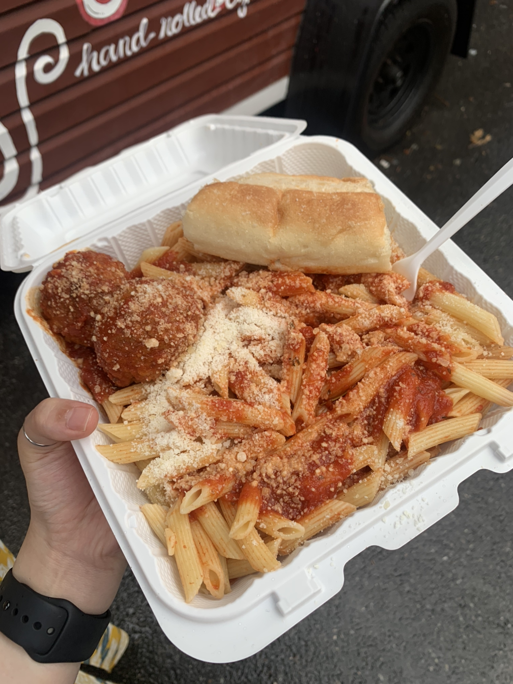 며칠 전 룸메이트가 보내준 링크를 통해 타이밍 좋게 집 근처에서 Italian Festival이 열린다는 것을 안 상태라, 안나 선생님과의 근황 토크 후 우리는 축제하는 곳으로 향하기로 했다. 사실 이때 비가 굉장히 많이 와서 내가 가져온 조그만 우산 하나를 사이좋게 나눠 쓰며 '어쩌면 폭우 때문에 축제가 취소된 거 아닐까'하는 우려와 함께 갔는데, 다행히도 축제는 그대로 진행되었고 폭우도 점차 멎기 시작했다. 물론 가리는 거 없이 잘 먹지만 원래도 이탈리아 음식을 좋아하는 편이라 파스타 미트볼, 라이스볼, 미트볼 따로 한 번 더 추가 주문에 와인까지 마시며 제대로 이탈리아 축제를 즐겼다. 파스타 미트볼을 구매한 곳에서는 오늘 우리가 첫 손님이라며 기념으로 우리 사진을 찍어가기도 했다. 파스타는 예상했던 그 맛 그대로 맛있었지만 미트볼은 엄청 짤 줄 알았는데 예상과 다르게 단 맛이 강해서 추가 주문을 할 정도로 취향에 잘 맞았다. 라이스볼의 경우 인기가 대단했는데, 먹어보니 미트볼과는 다른 매력으로 단짠단짠이 잘 어우러진 것이 역시 인기가 많은 이유가 있었다.