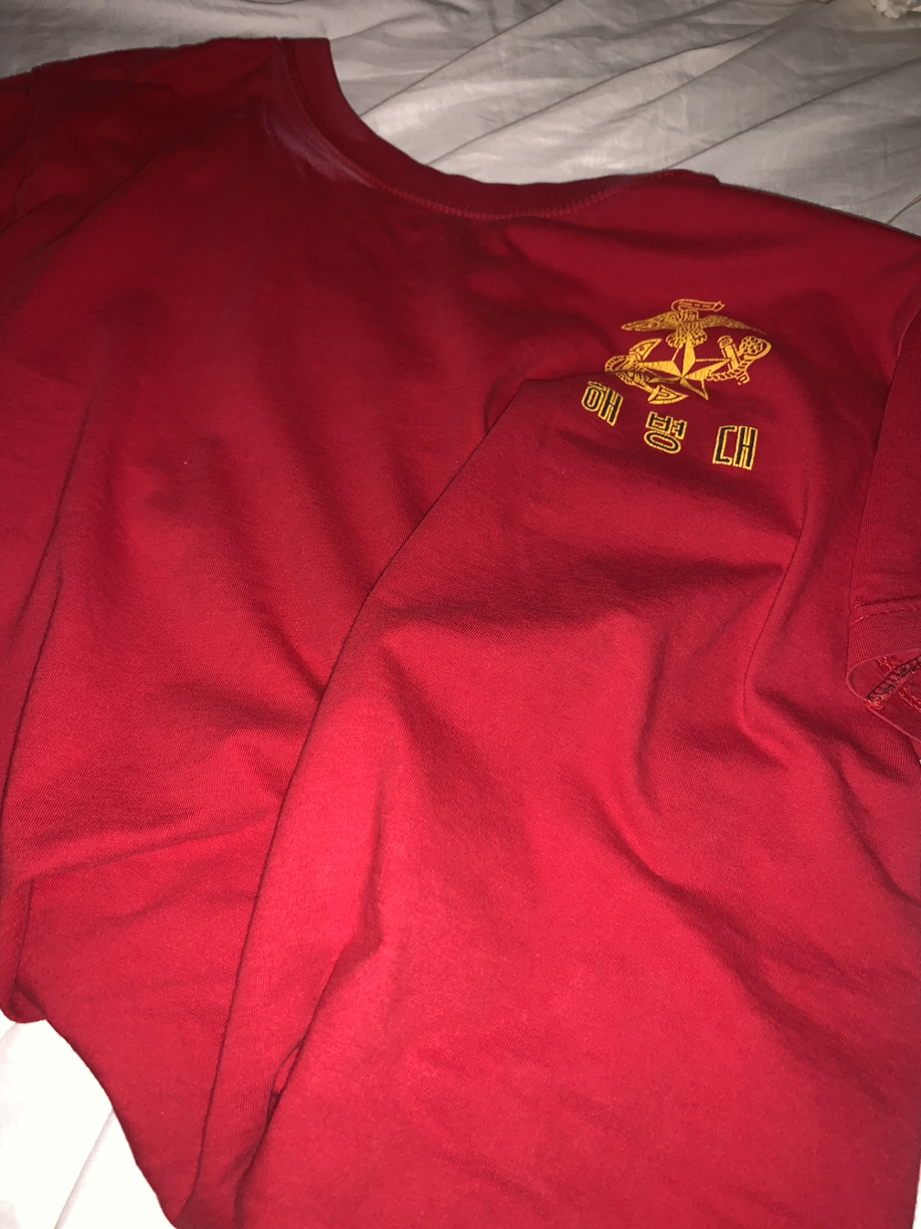 "한국에서 남자들은 보통 군대를 필수로 가야 하는데, 그 군대 중 ‘해병대’가 있고 해당 군대는 강하다는 인식이 있어서 ‘귀신 잡는 해병대’라는 수식어를 가지고 있어요. (아닐 수 있습니다.) 무서운 걸 무서워하면서도 굳이 무서운 걸 찾아보고 밤에 무서워하는 저를 위해 입고 자면 귀신이 안 나타날 거라며 안심시켜 주기 위해 해병대를 복무한 전남자친구가 선물해 주었어요. 생각해 주는 마음이 너무 고마웠고, 실제로 저는 그걸 굳게 믿고 있어서 미국에 오면서도 그 티셔츠를 들고 왔습니다.”