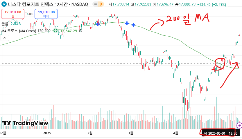 5월 들어오고 나서, 200일 이동평균선을 다시금 치고 올라왔다. 200일 이평선은 차트 보는 사람들이 중요하게 체크하는 포인트이다.