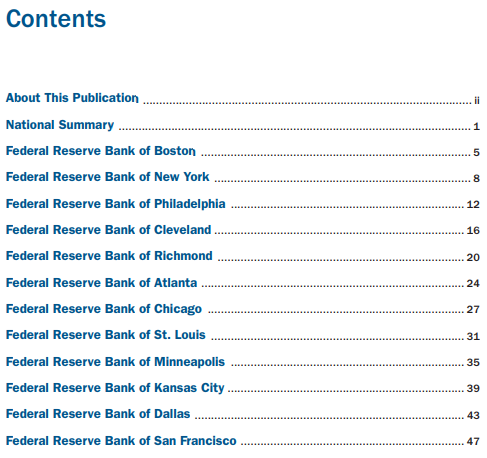 이후에는 각 자치구를 관할하는 각 지역 연준 은행들이, 그들 구역 안에서의 내용을 순서대로 서술한다. 보스턴, 뉴욕, 필라델피아, 클리브랜드, 리치몬드, 애틀란타, 시카고, 세인트 루이스, 미니애폴리스(미네소타), 캔자스 시티, 댈러스, SF가 있다.