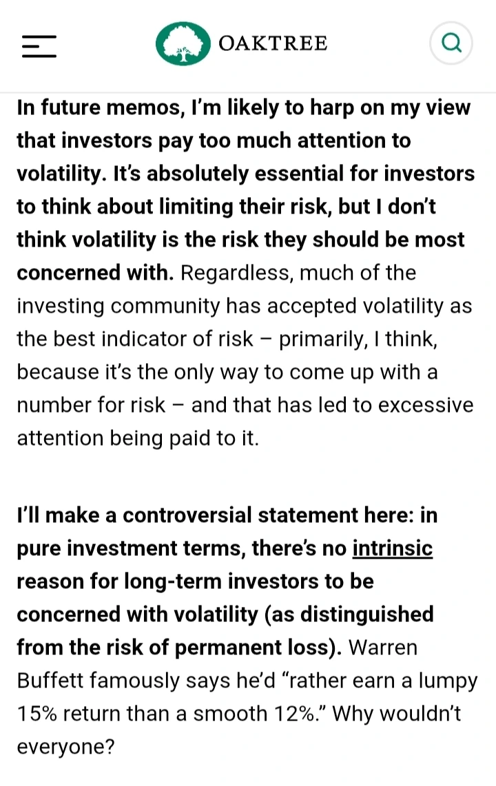 앞으로 쓸 메모들에서 나는 ‘투자자들이 변동성에 지나치게 집착한다’는 내 생각을 자주 강조하게 될 것 같다. 투자자라면 리스크를 제한하려는 사고방식이 필수적이지만, 내가 보기엔 변동성은 그들이 가장 우려해야 할 리스크가 아니다.