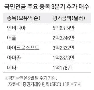 7-9월 국민연금은 미국 주식 포트폴리오의 비중 상위 종목인 엔비디아, 애플, 마이크로소프트, 아마존, 메타, 알파벳, 테슬라를 추가 매입했다. M7 3분기 순매수액이 약 2조 3000억 원 정도라고 한다.