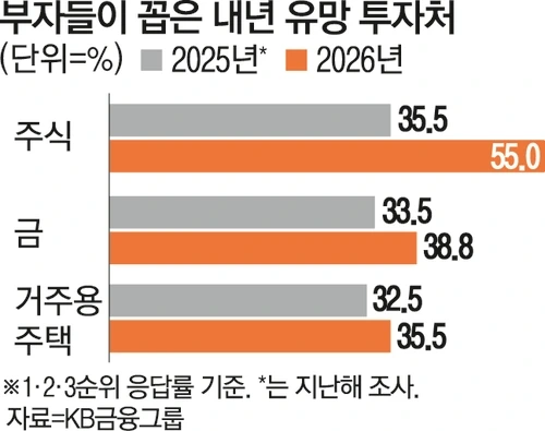 지금 추세대로라면 2~3년 안에 부자 숫자가 50만명을 넘어설 전망이다. 한국 부자들은 올해 부동산보다 주식 등 금융 투자를 통해 더 많이 자산을 불렸다. 부자들의 절반 이상이 내년에도 주식을 가장 유망한 투자처로 꼽으며 달라진 재테크 지형을 드러냈다.