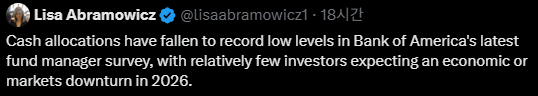 이와 관련하여 '2026년에 시장이 약세로 전환될 거라 보는 참여자가 거의 없다고 보는 시각' 그리고 '지나친 낙관정도로 보아 베어마켓의 징조라고 보는 시각'이 공존하고 있다.