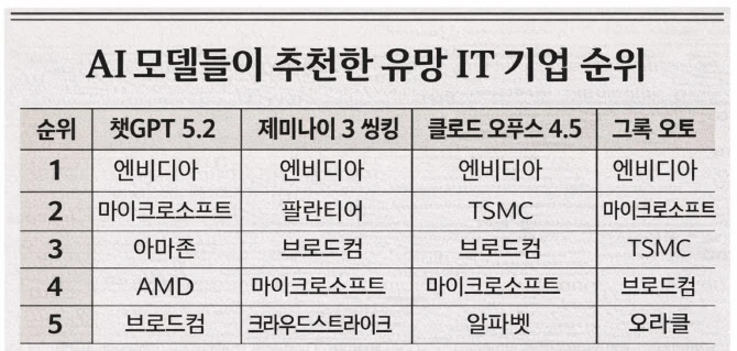 마켓워치는 각 챗봇이 세부 답변에서 차이를 보였음에도 “그다지 새로운 결과를 보여주진 못했다. 숨겨진 기회를 발굴하기보다는 현재 AI 업계를 주도하는 AI 인프라 관련 업체 및 하이퍼스케일러 기업들을 획일적으로 선택했다”고 평가했다.