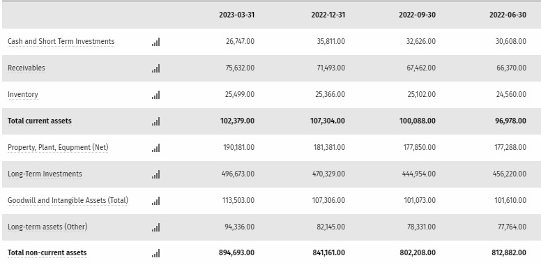 작년 하반기부터 버크셔 헤서웨이의 자산 보유량 추이를 보면 대체로 증가추세에 있다.(Total current assets의 4개 항목을 보면 알 수 있다.) 확실히 뭘 많이 샀다는 뜻이다.