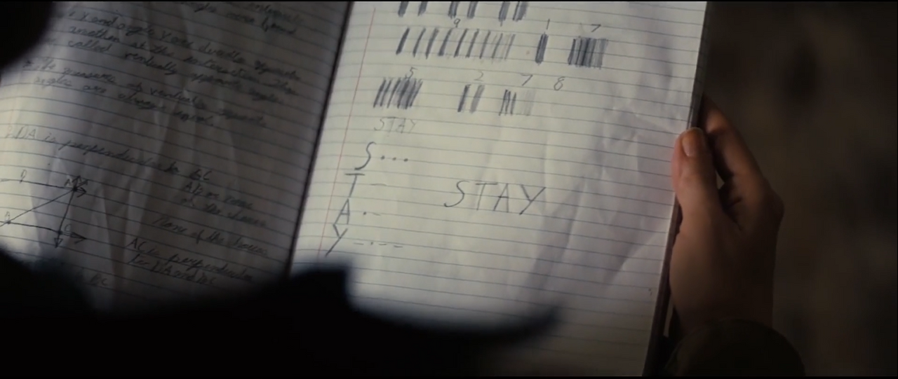 '매튜 맥커너히'가 과거의 자신에게 시간을 거슬러 모스 부호를 보내는 씬이 있다. 'S T A Y'를 뜻하는 부호를 중력을 사용해 보낸다. 차고 있는 손목시계의 시침이 까딱거리며 과거의 자신에게로 코드를 전달한다.