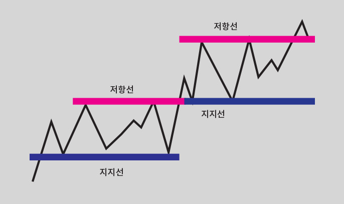지지선, 저항선은 변곡점의 윗꼭지 / 아래 꼭지에 긋는 수평선이다. 그림으로 보면 다음과 같다.