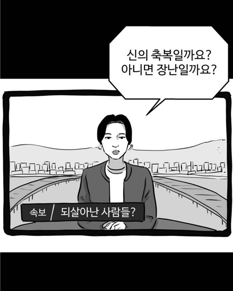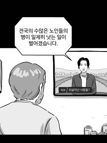 <언다잉>의 세계관은 1화에서 언급된 이 대화에 응축되어 있다. 이 웹툰은 전국의 수많은 노인들의 병이 갑자기 낫게 되는 그 순간의 표정을 담는 것에서부터 시작한다. 아픈 몸이 이제 더 이상 아프지 않게 되었으니 너무나 감사하고 기쁘다. 하지만 이 웹툰의 인물들은 이러한 불가사의한 일을 반기지 못한다. 기적 같은 일이 발생했음에도 불구하고 마냥 기뻐하지 못한다. 독자들께서도 생각해 보시길 바란다. 자신이 사랑하는 부모님이 어느 순간 갑자기 아프지 않게 된다면 그것만큼 좋은 일이 어디 있겠는가. 그러나 이 웹툰은 이러한 일반성에 대해 질문한다. 이러한 모순(?)에 천천히 반문한다. 그렇다면 대체 어떤 서사를 품고 있는 것일까. 지금 현재 <언다잉>은 연재 중 이어서 속단할 수는 없지만, 세 사람의 인물을 통해 이러한 서사를 끌고 간다. 용철, 광석, 지훈이 그들이다.