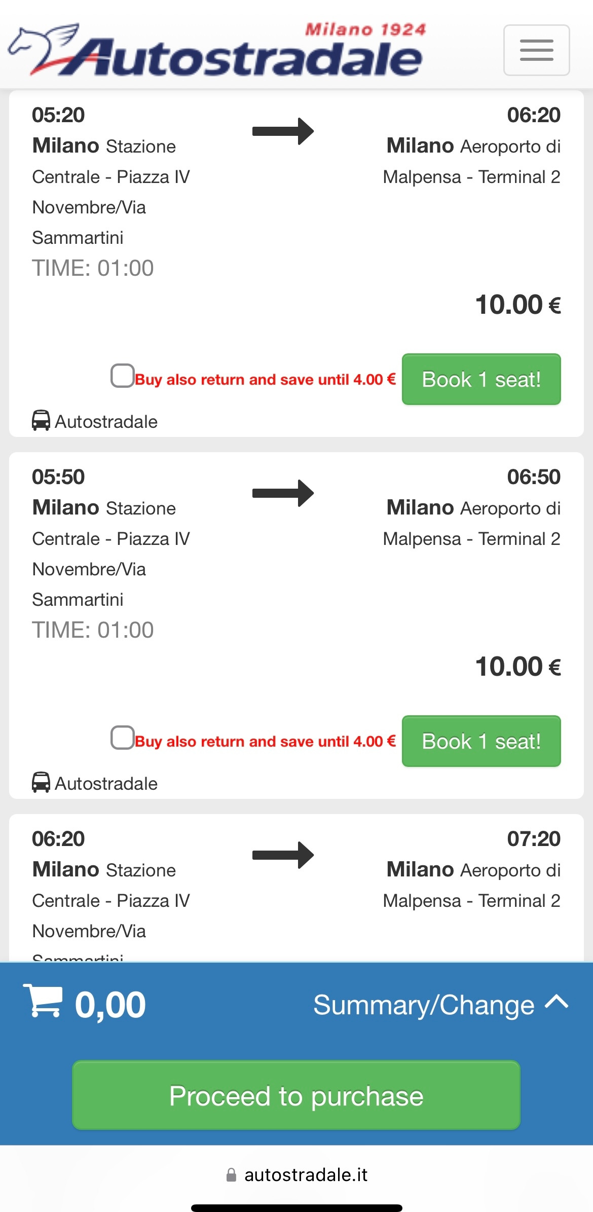 4. 밀라노 중앙역에서 밀라노 말펜사 공항으로 가는 버스: 여러 버스가 있다고 하는데 말펜사 익스프레스가 아닌 오토스트라데일(autostradale)에서 티켓을 살 것을 추천한다. 실은 처음에 말펜사 익스프레스 사이트에서 티켓을 사고 이메일로 티켓을 받았는데 뭔가 이상했다. 예약자들 이름도 없고 버스 출발 시간도 나오지 않고 큐알코드 하나 왔는데 뭔가 불안했다. 예약할 때부터 카드번호도 잘 입력이 안 돼서 힘들었었다. 그 버스회사에서 티켓을 샀다가 가짜 티켓이라고 해서 현장에서 다시 티켓을 구매했다는 리뷰를 읽고 확신이 섰다. 불안한 마음으로 출국날 버스 정류장으로 향하느니 3명의 티켓값, 30유로를 날리는 걸 아까워하지 말고 마음의 평화와 확신을 돈을 주고 사는 편을 택하기로 했다.