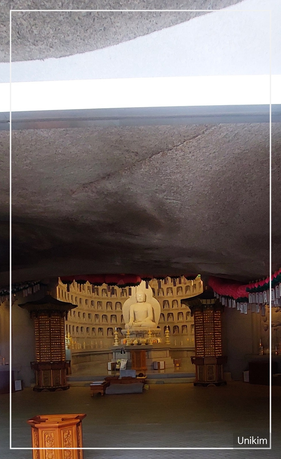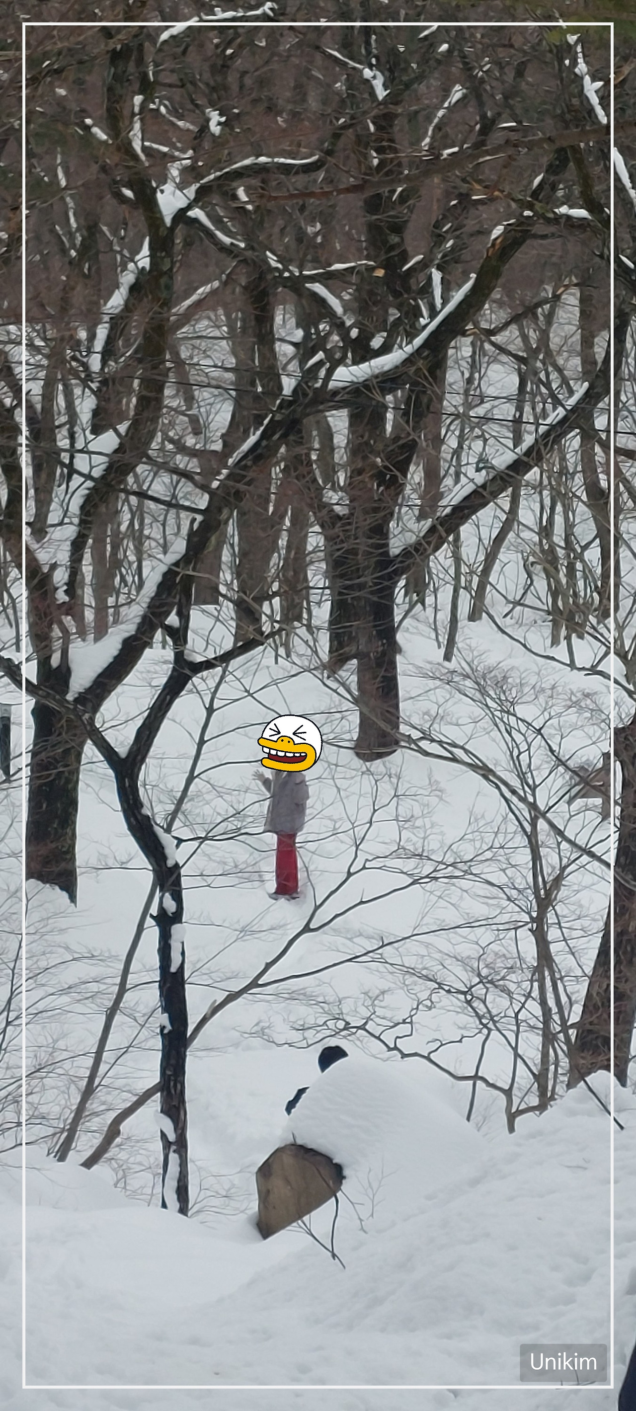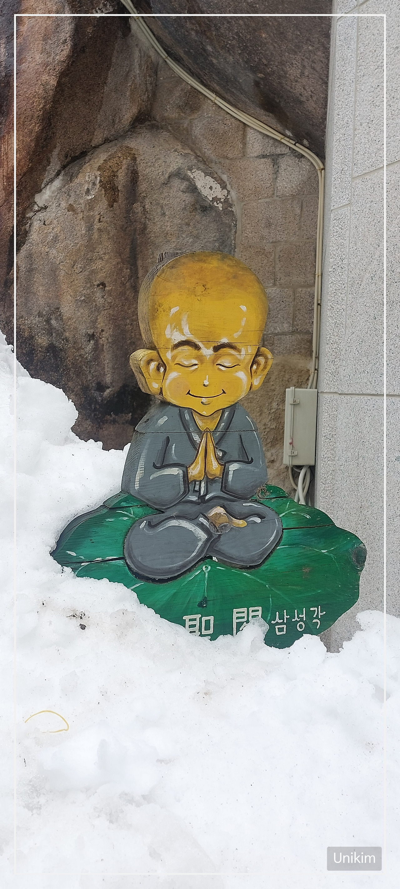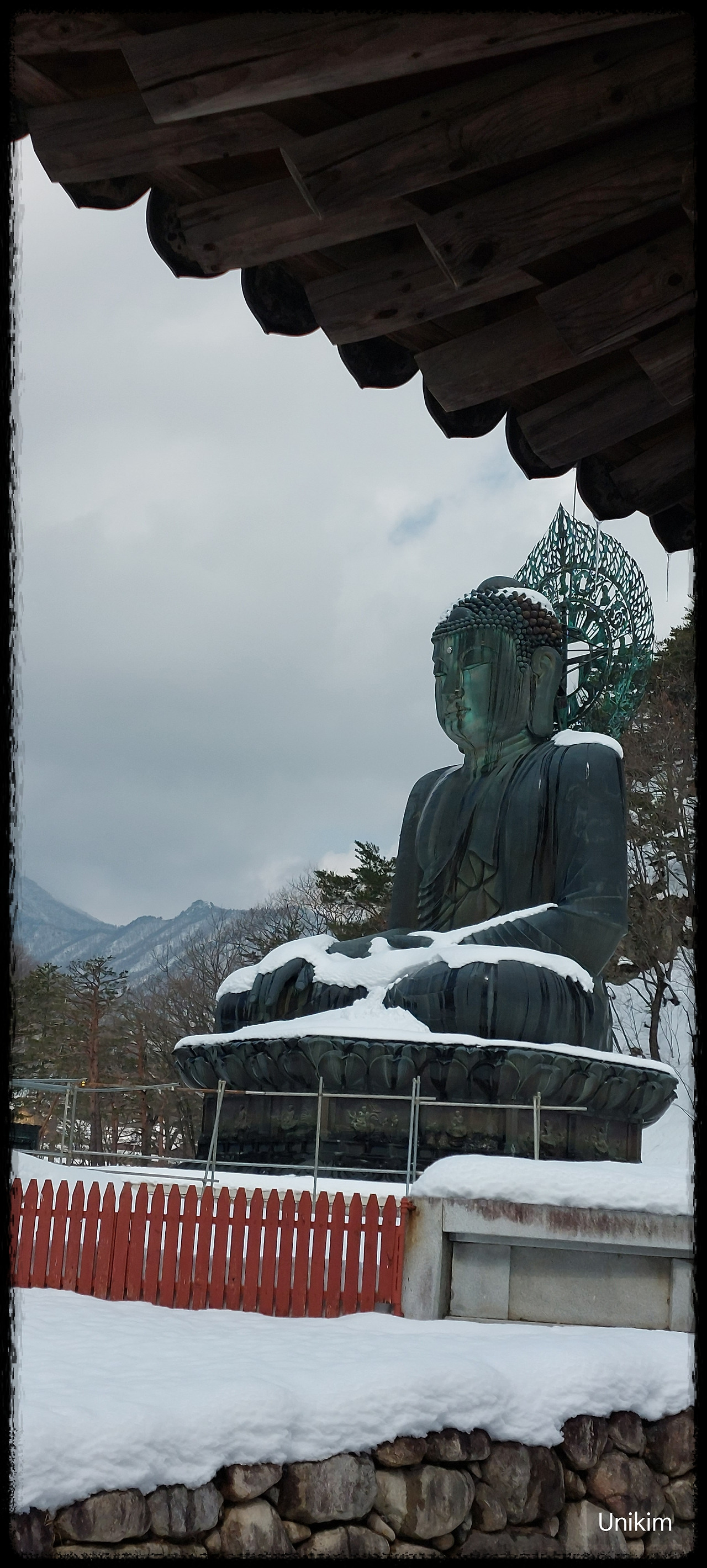 전진을 하며 발걸음을 옮기다 보니 고요한 풍경 속에서 불상이 모습을 드러냈다. 눈 덮인 산과 하늘이 어우러진 그곳에서 고요하게 앉아 있는 불상은 마치 시간을 초월한 존재처럼 우뚝 서 있었다. 그 신성한 모습에 가까이 다가가며 자연의 숨결과 신앙의 경건함이 한데 어우러진 순간을 느꼈다.