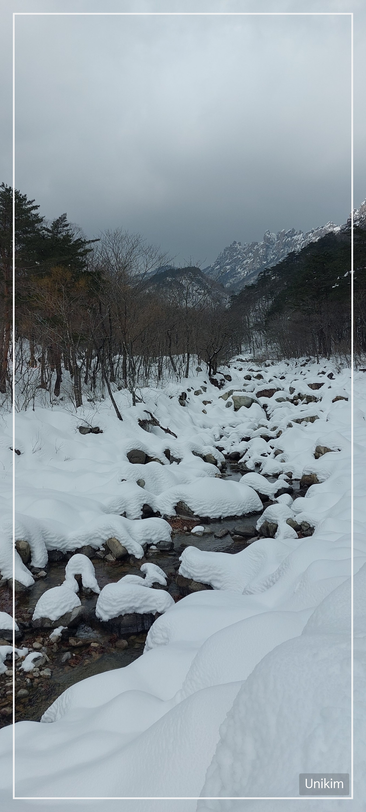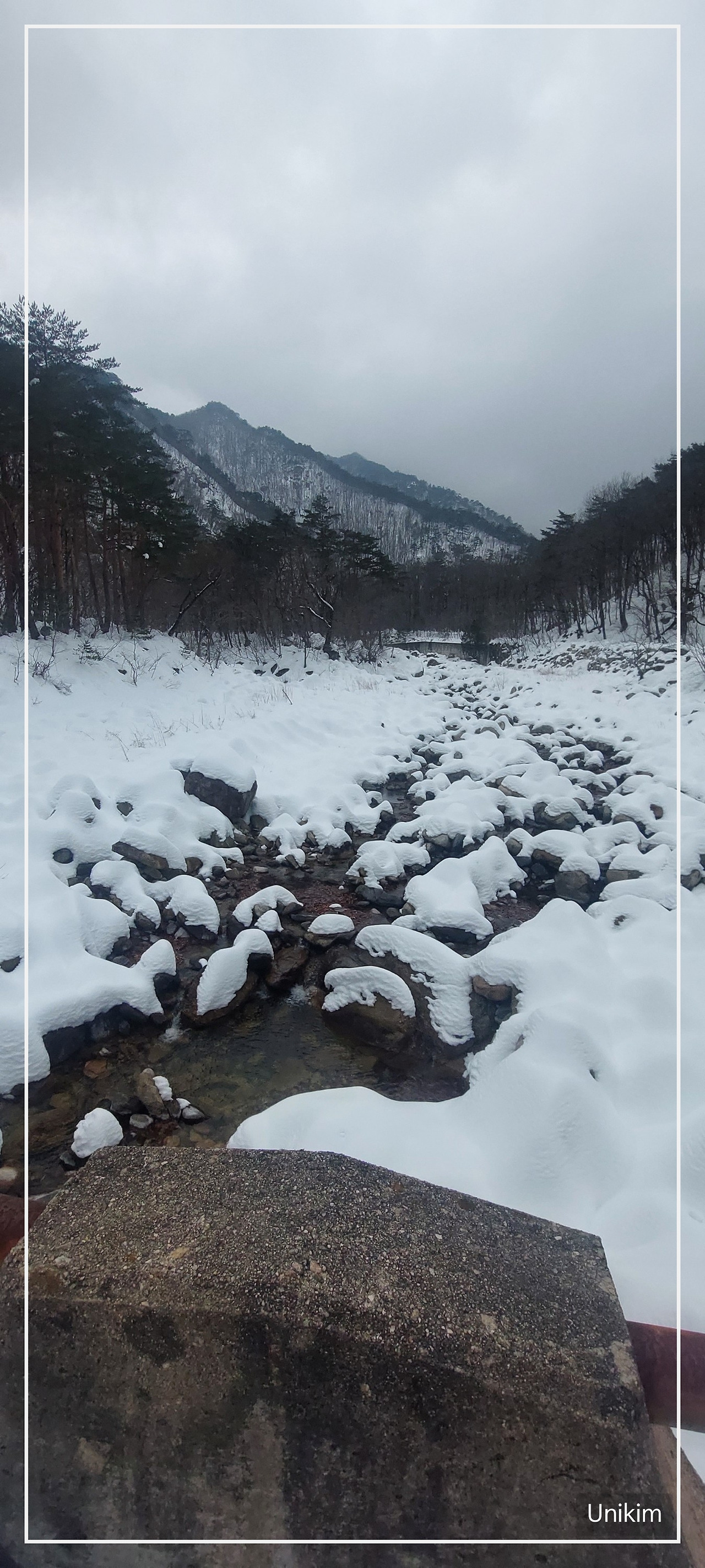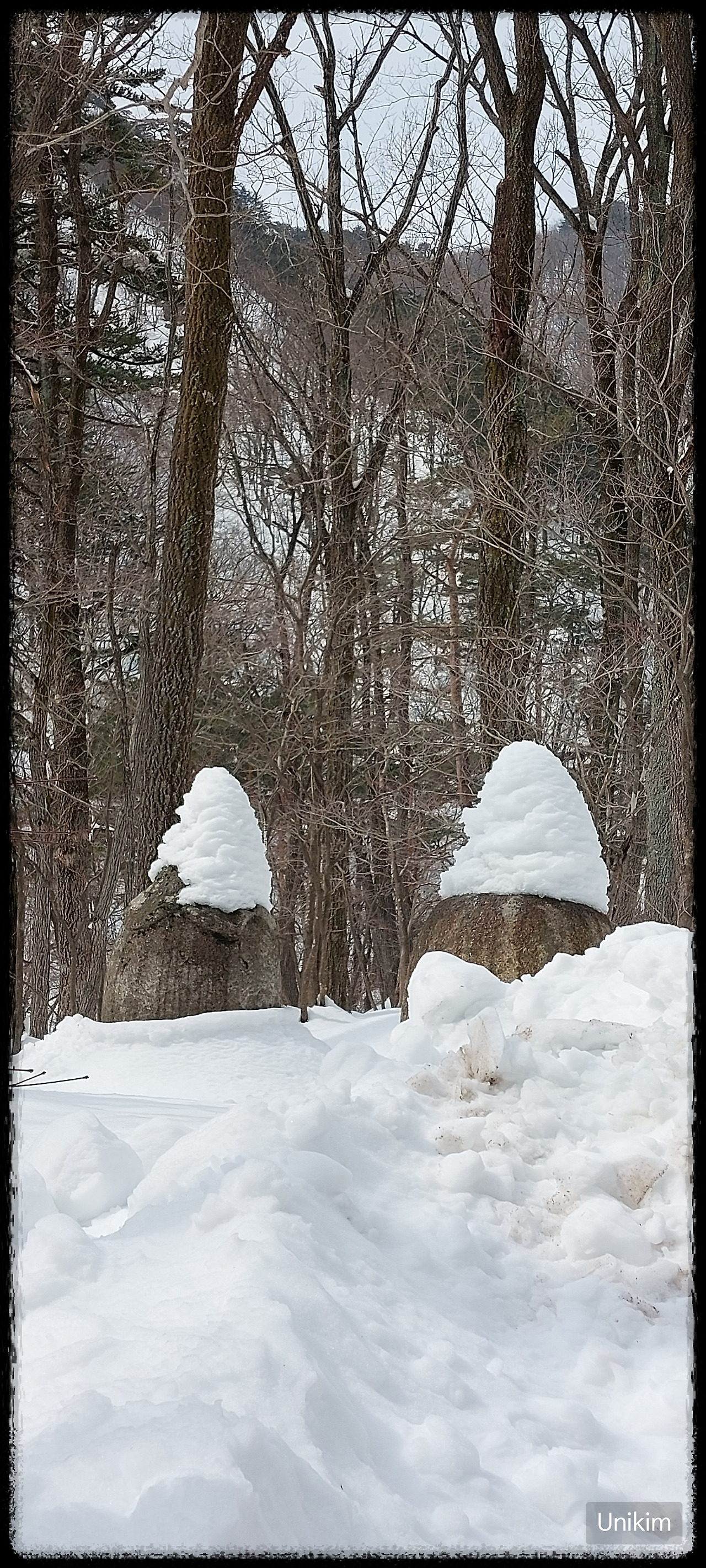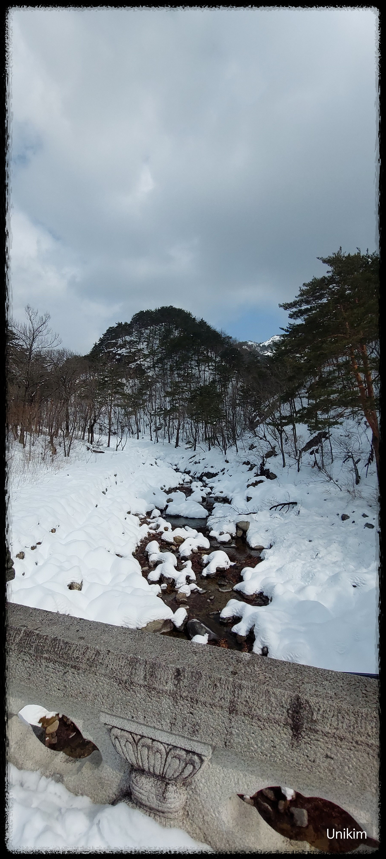 사천왕문을 지나 담쟁이가 가득한 돌담을 지나 우린 위로 위로 걸어갔다. 그러다 문득 아래쪽을 내려다보게 되었다. 계곡물은 고요히 흐르고 있었고 그 위로 마치 자연이 정성스레 빚어 올린 듯한 동그란 눈모형이 소복이 쌓여 있었다. 부드러운 곡선을 그리며 이어진 눈들은 한 폭의 겨울 풍경화를 완성하고 있었다. 차가운 공기 속에서 포근하게 느껴지는 그 모습이 아름답기도 하고 귀엽기도 했다. 어느 애니메이션의 배경 같기도 하고 엠보싱 화장지의 단면을 확대해 놓은 것 같기도 했다. 아무튼 그 장면은 참 예뻤다^^