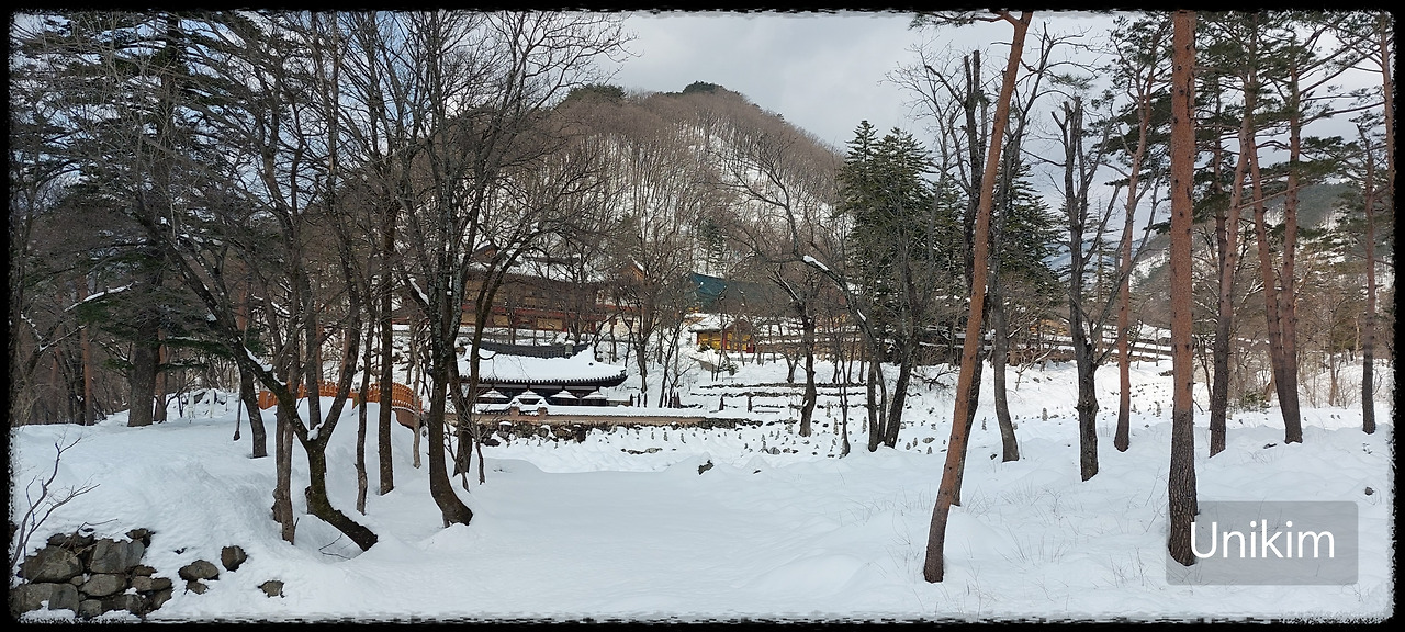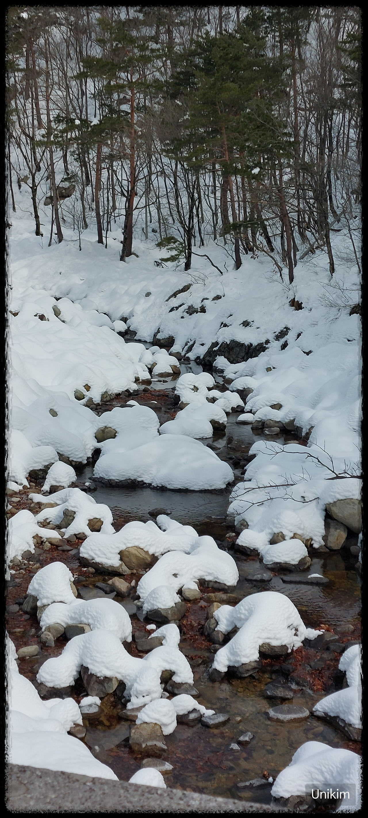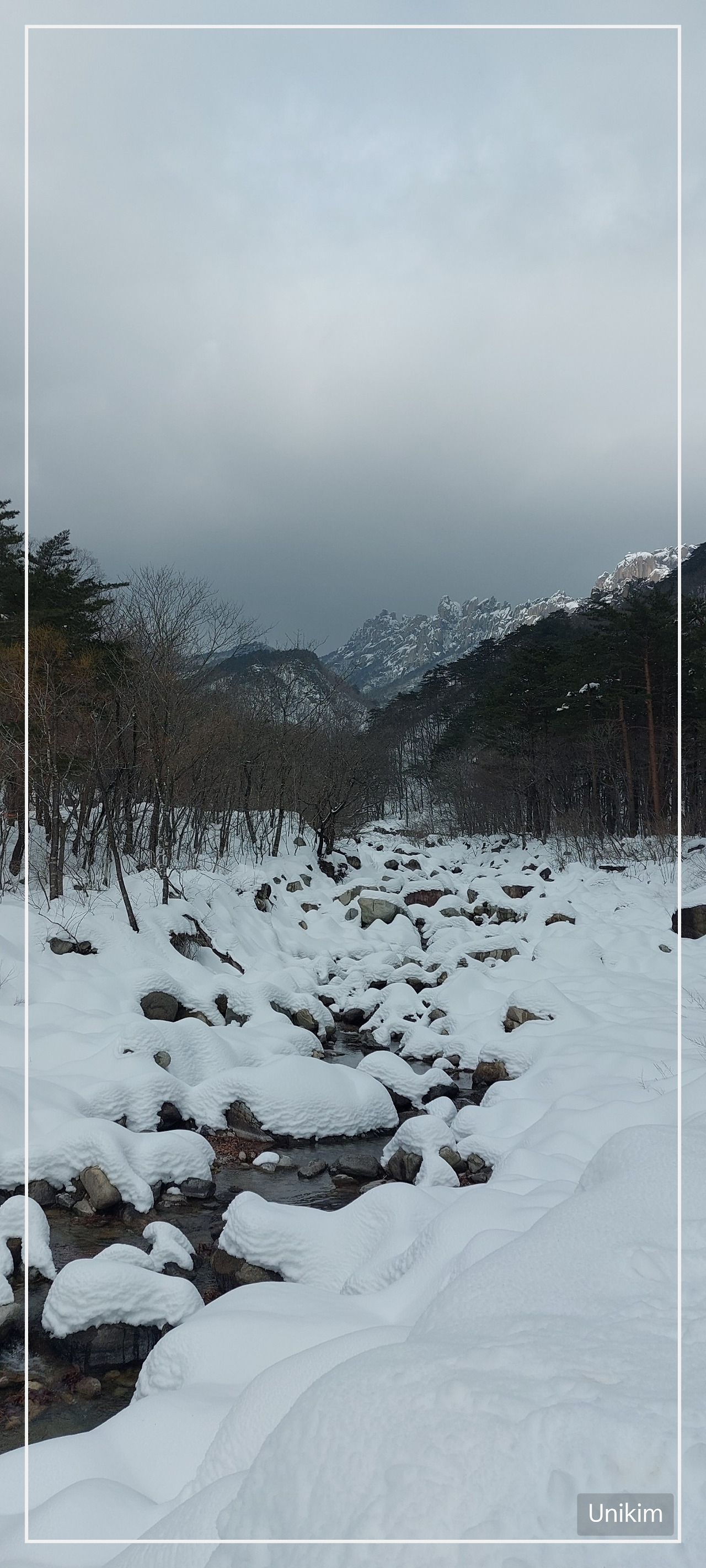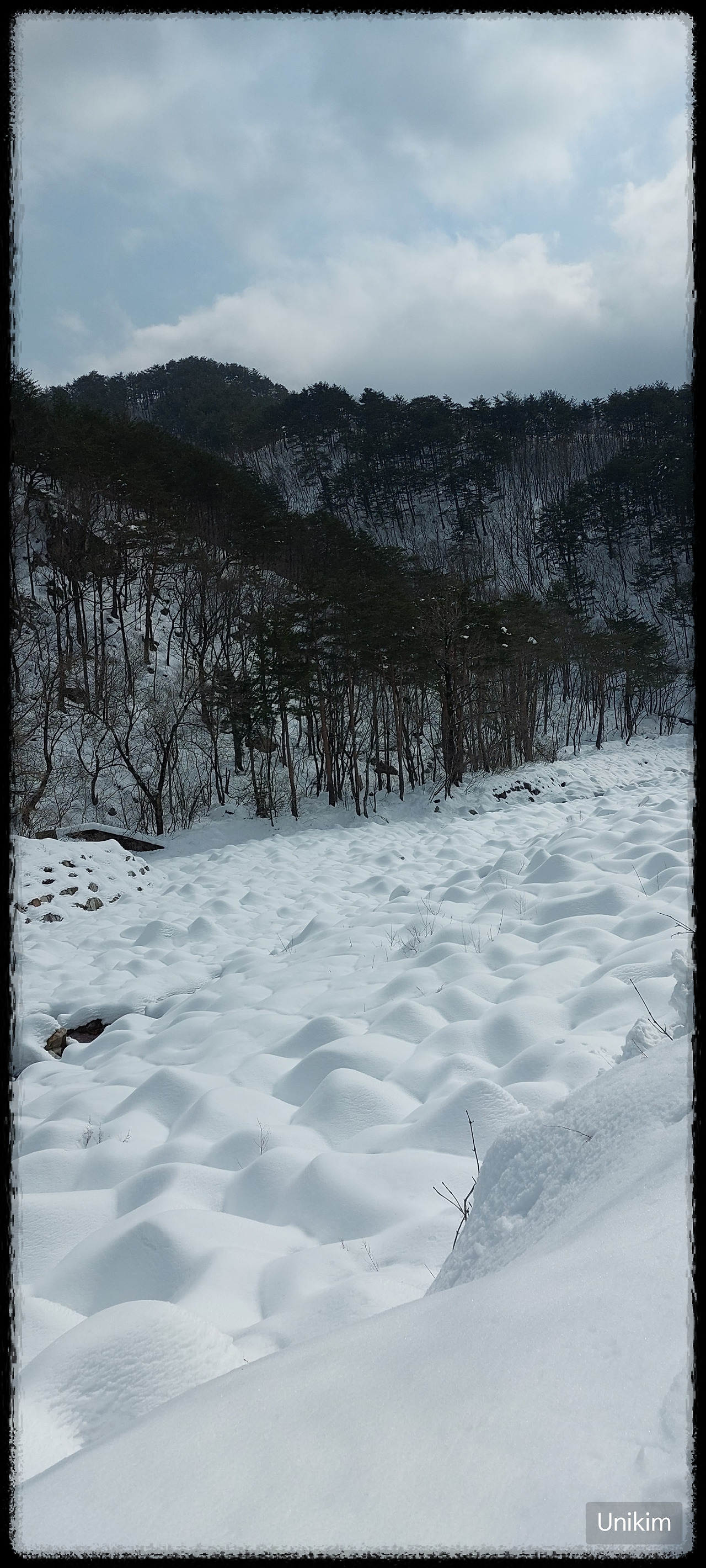 사천왕문을 지나 담쟁이가 가득한 돌담을 지나 우린 위로 위로 걸어갔다. 그러다 문득 아래쪽을 내려다보게 되었다. 계곡물은 고요히 흐르고 있었고 그 위로 마치 자연이 정성스레 빚어 올린 듯한 동그란 눈모형이 소복이 쌓여 있었다. 부드러운 곡선을 그리며 이어진 눈들은 한 폭의 겨울 풍경화를 완성하고 있었다. 차가운 공기 속에서 포근하게 느껴지는 그 모습이 아름답기도 하고 귀엽기도 했다. 어느 애니메이션의 배경 같기도 하고 엠보싱 화장지의 단면을 확대해 놓은 것 같기도 했다. 아무튼 그 장면은 참 예뻤다^^