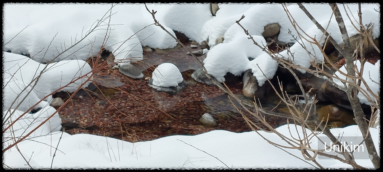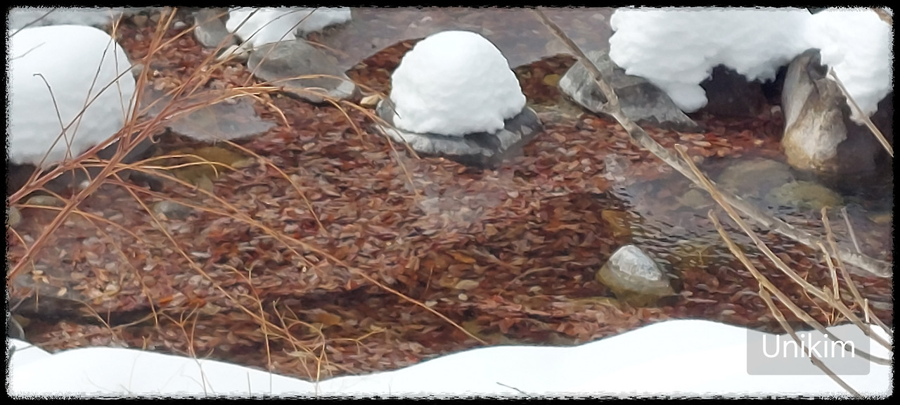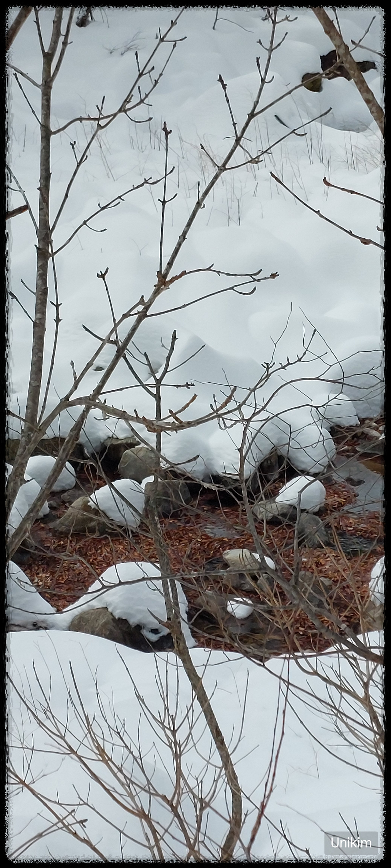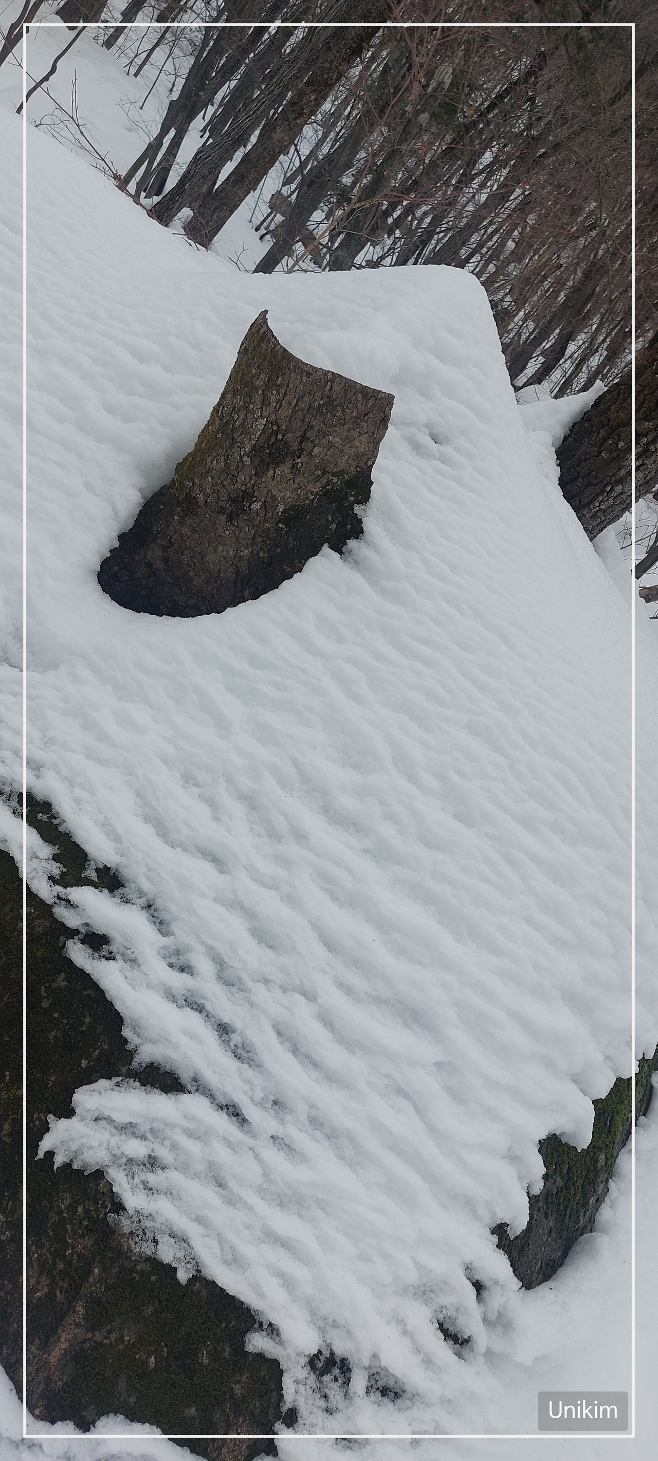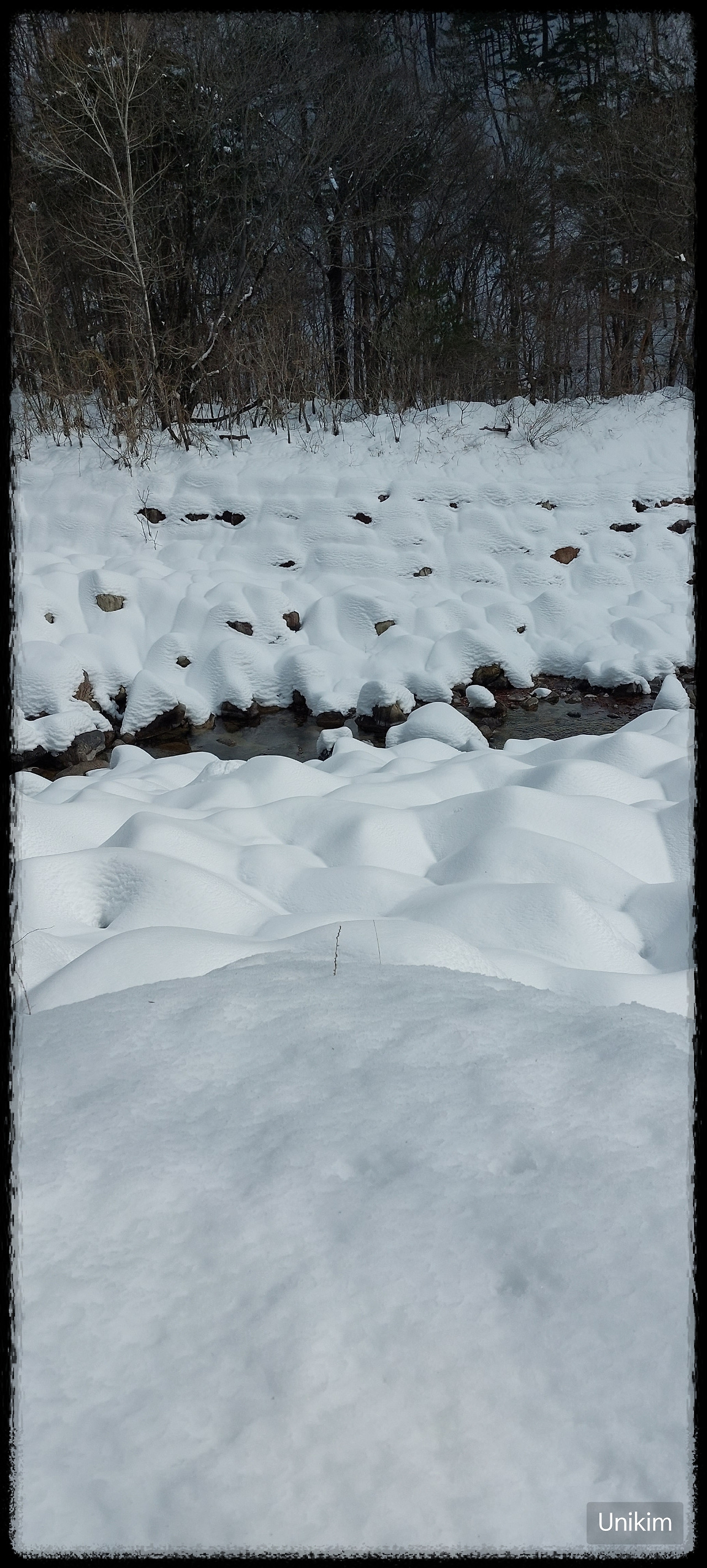 사천왕문을 지나 담쟁이가 가득한 돌담을 지나 우린 위로 위로 걸어갔다. 그러다 문득 아래쪽을 내려다보게 되었다. 계곡물은 고요히 흐르고 있었고 그 위로 마치 자연이 정성스레 빚어 올린 듯한 동그란 눈모형이 소복이 쌓여 있었다. 부드러운 곡선을 그리며 이어진 눈들은 한 폭의 겨울 풍경화를 완성하고 있었다. 차가운 공기 속에서 포근하게 느껴지는 그 모습이 아름답기도 하고 귀엽기도 했다. 어느 애니메이션의 배경 같기도 하고 엠보싱 화장지의 단면을 확대해 놓은 것 같기도 했다. 아무튼 그 장면은 참 예뻤다^^