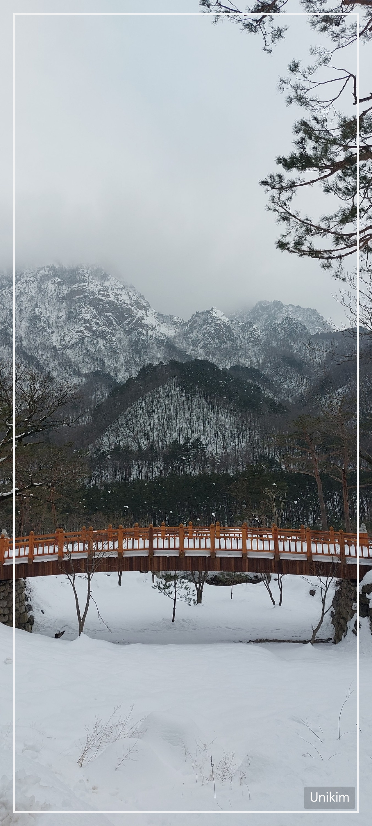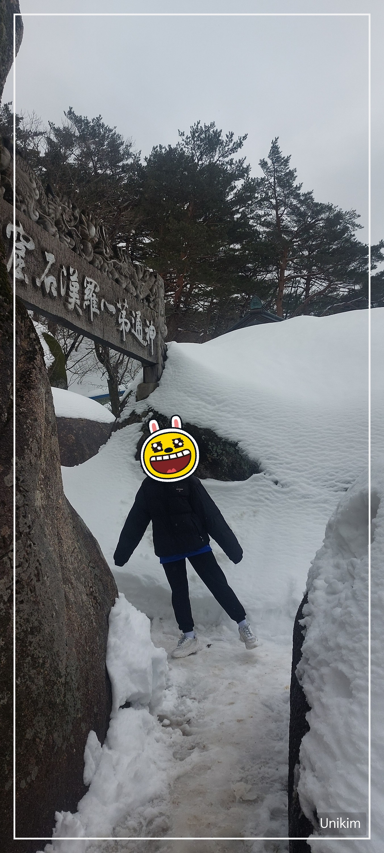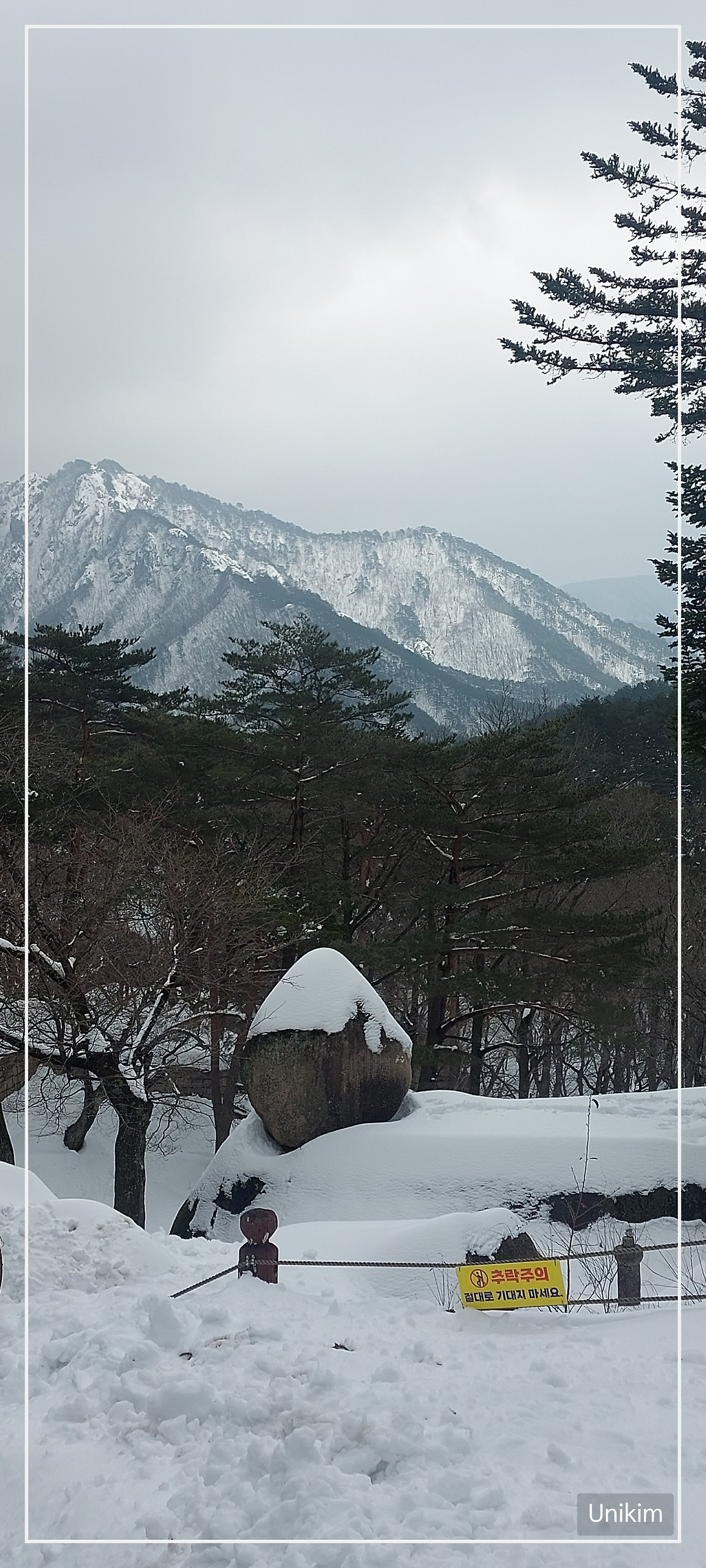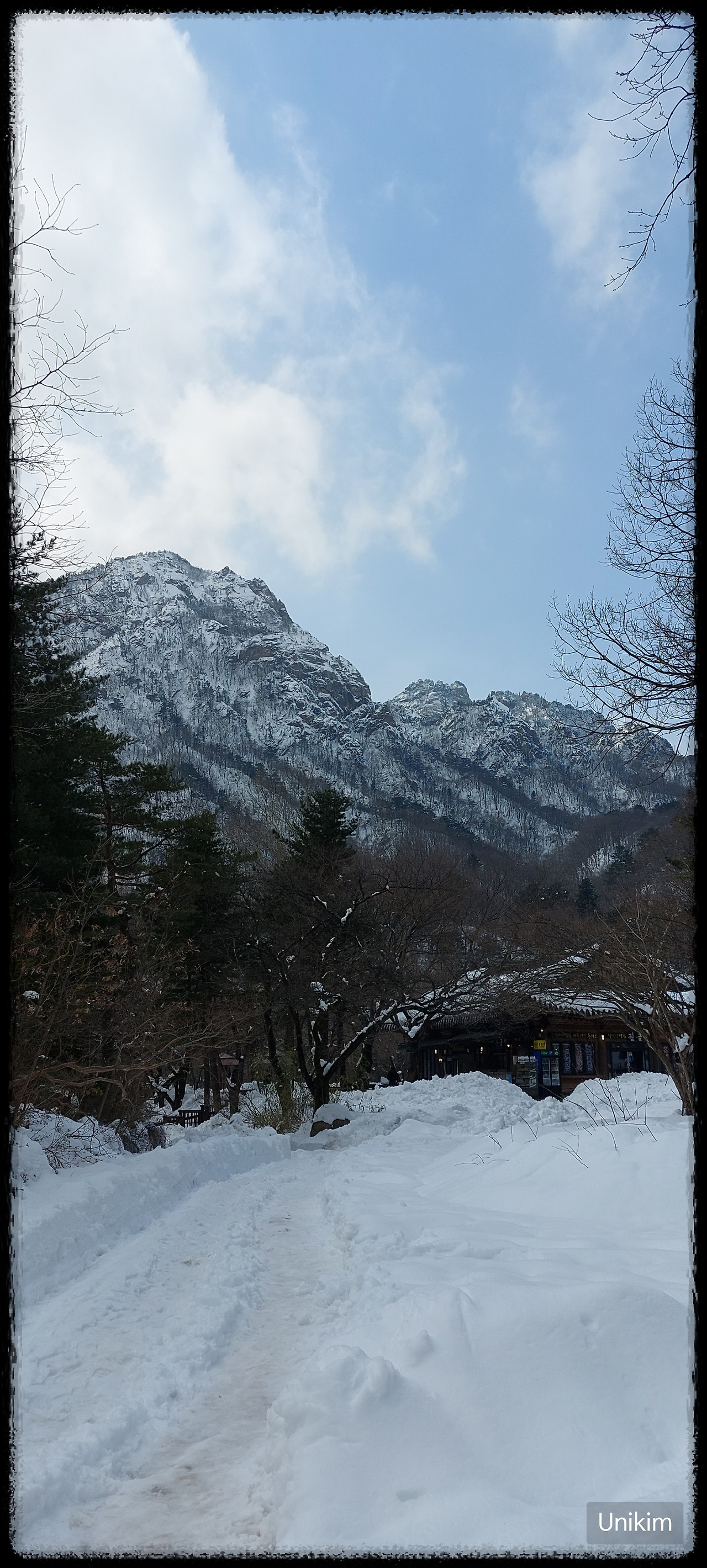 간단한 간식을 먹고 나와 기념사진들을 찍었으며 둘러보니 "조계선풍 시원도장 설악산문"이라고 적힌 현판과 함께 입구문이 눈에 들어왔다. 커다란 입구의 문과 그 뒤로 펼쳐진 설경에는 가히 영혼을 울리는 웅장함이 있었다. 우린 이 멋진 문을 지나 설악산 국립공원에 들어섰다.