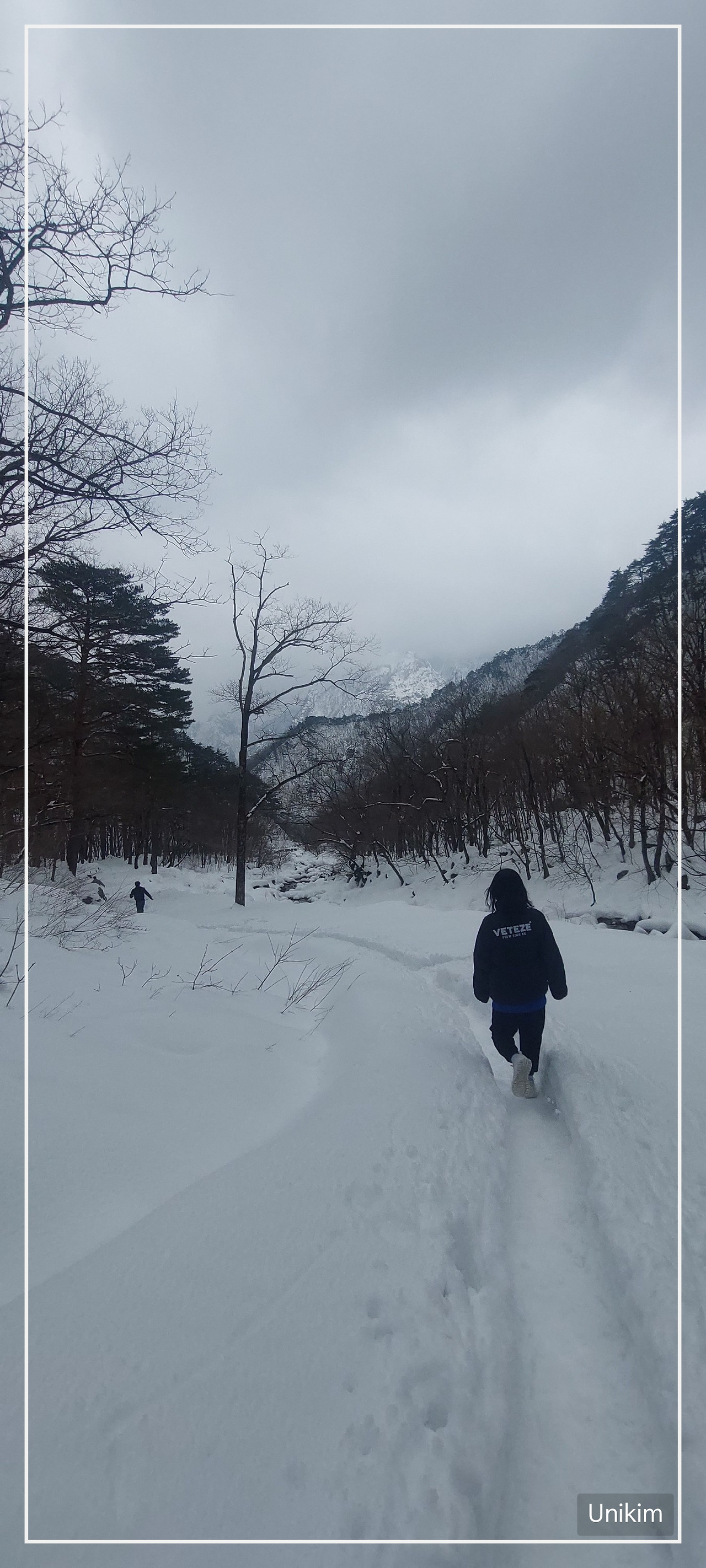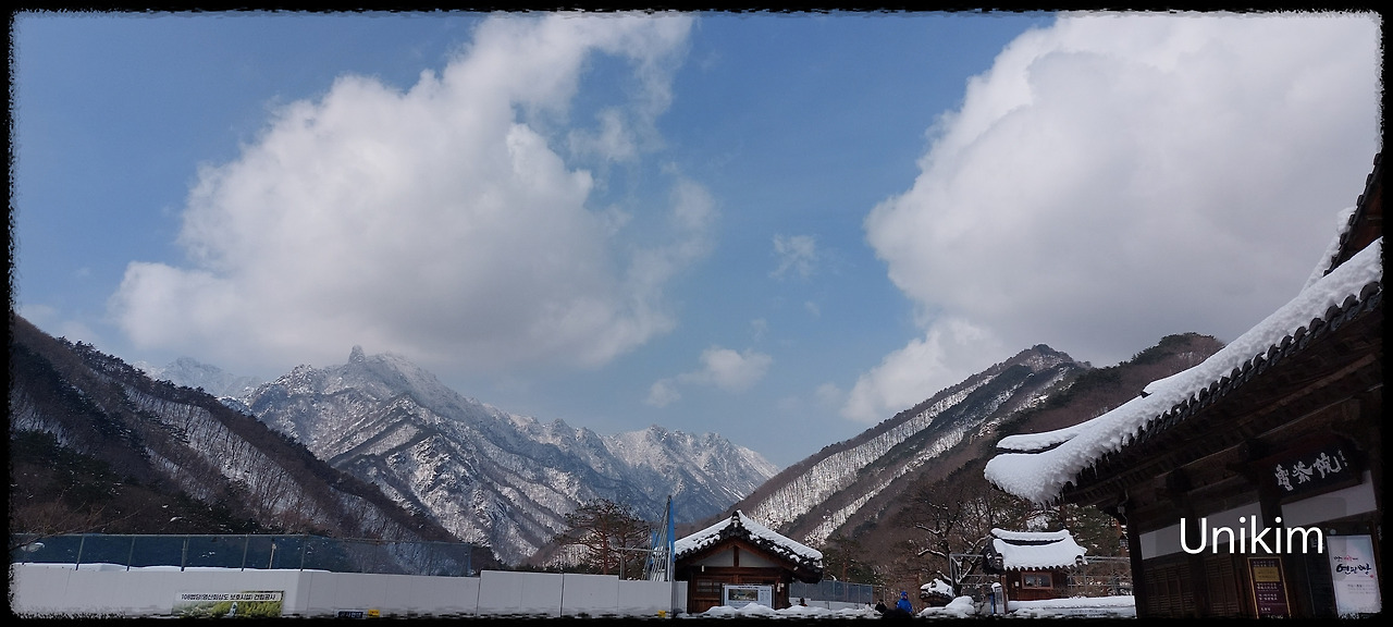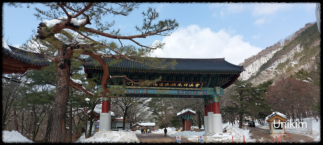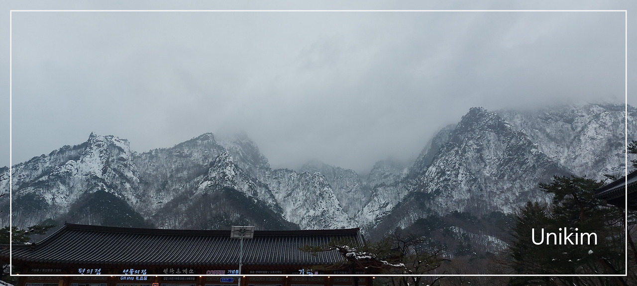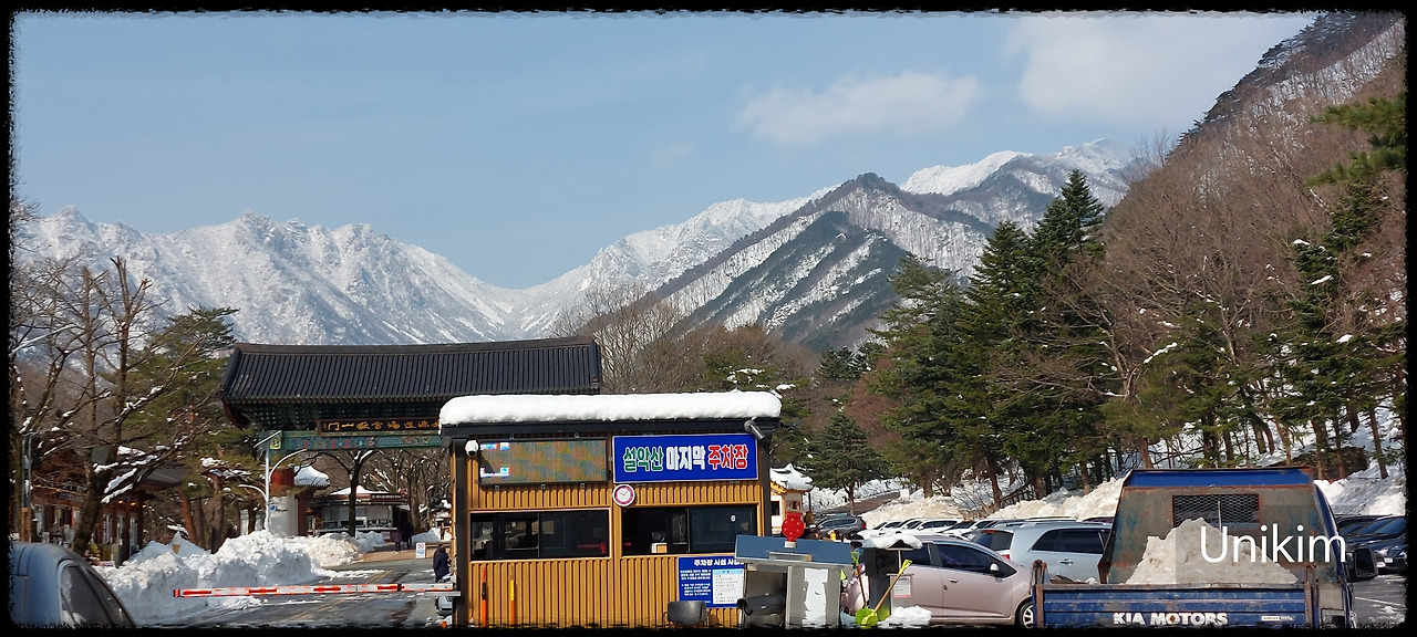 간단한 간식을 먹고 나와 기념사진들을 찍었으며 둘러보니 "조계선풍 시원도장 설악산문"이라고 적힌 현판과 함께 입구문이 눈에 들어왔다. 커다란 입구의 문과 그 뒤로 펼쳐진 설경에는 가히 영혼을 울리는 웅장함이 있었다. 우린 이 멋진 문을 지나 설악산 국립공원에 들어섰다.