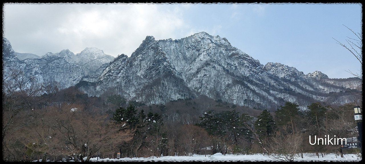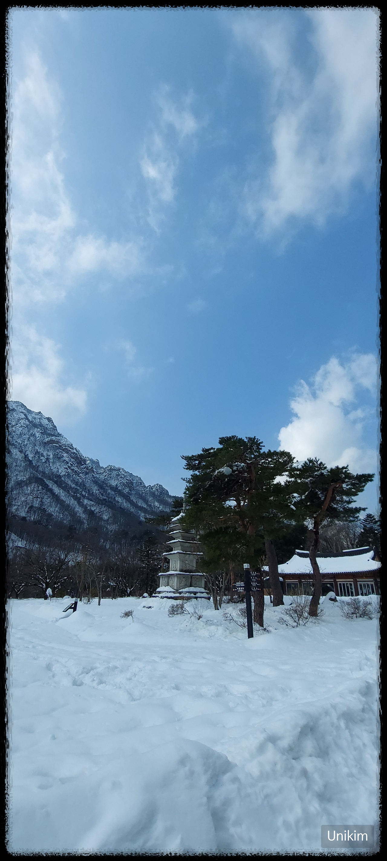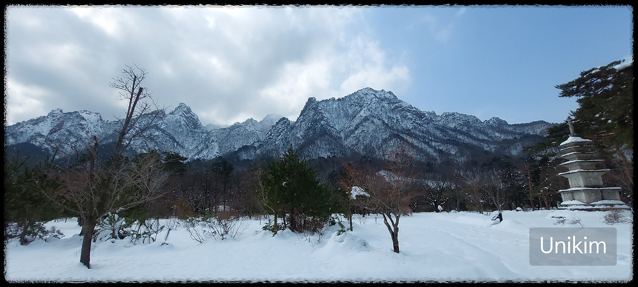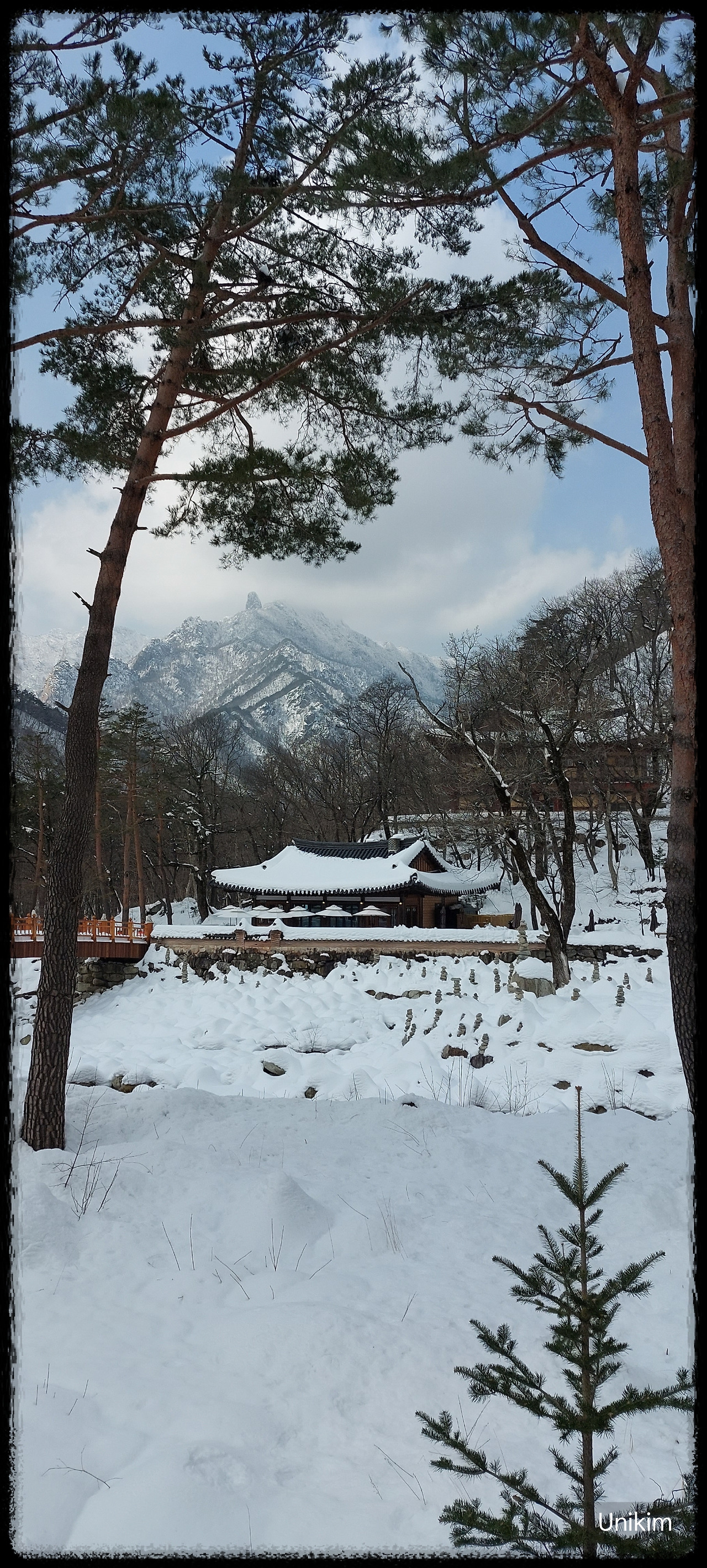 간단한 간식을 먹고 나와 기념사진들을 찍었으며 둘러보니 "조계선풍 시원도장 설악산문"이라고 적힌 현판과 함께 입구문이 눈에 들어왔다. 커다란 입구의 문과 그 뒤로 펼쳐진 설경에는 가히 영혼을 울리는 웅장함이 있었다. 우린 이 멋진 문을 지나 설악산 국립공원에 들어섰다.