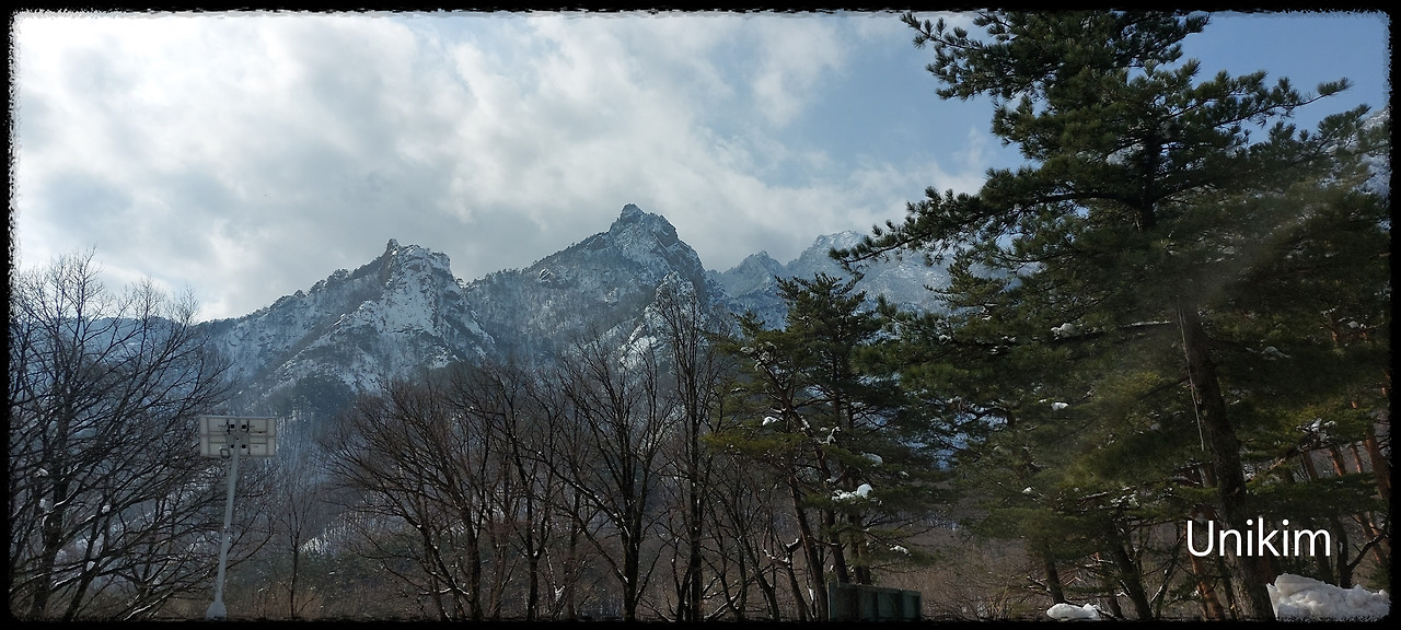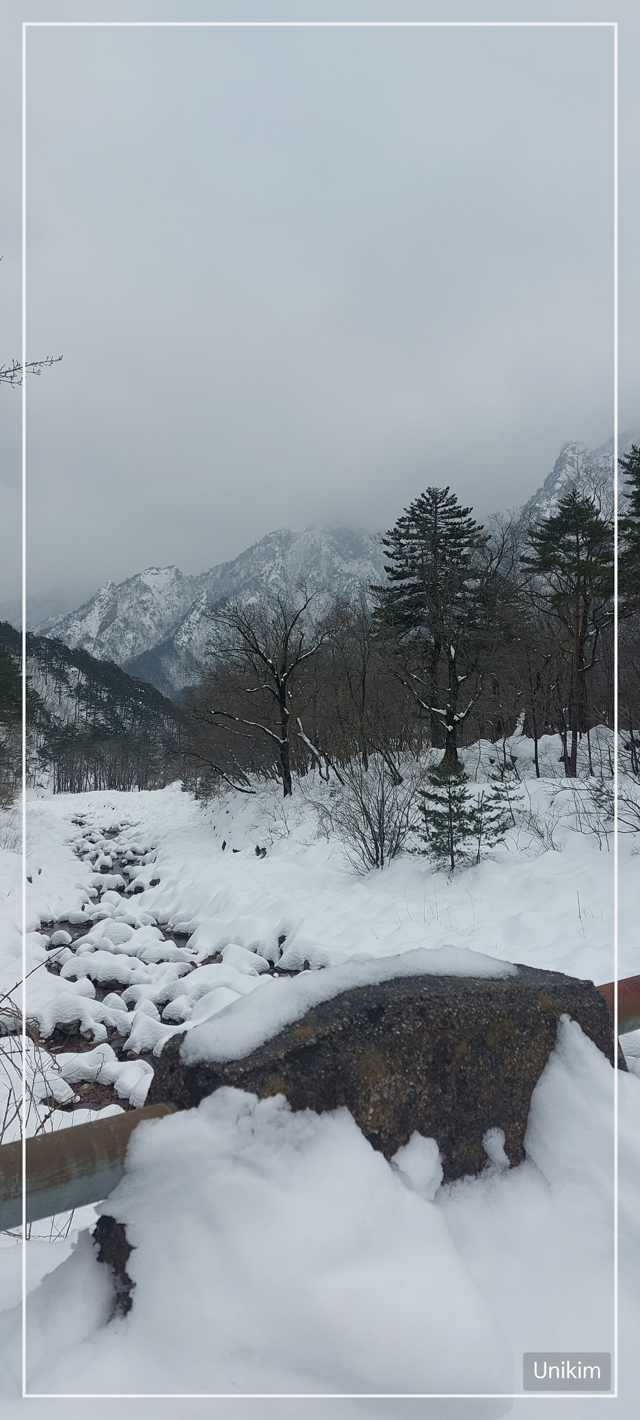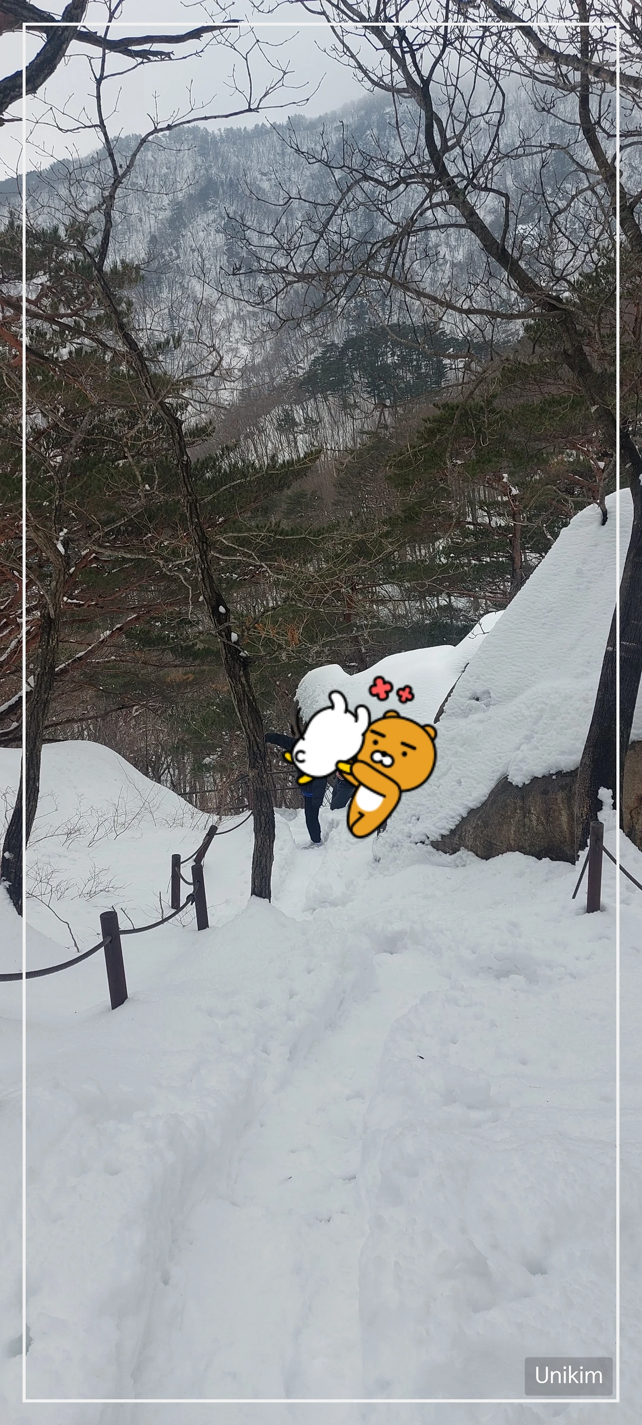 사실 우린 설악산에 도착하기 전만 해도 눈이 최근에 왔다는 생각을 하지 못했다. 산간지역이니까 겨울에 내린 눈이 찬 기온에 녹지 않았으리라 생각했었다. 얼마나 단순한 생각이었는가... 하지만 설악산을 거닐며 알았다. 이 눈은 최근에 쌓인 눈.... 춘삼월에 눈이 온 게로구나!! 네이버에 날씨를 검색해 보니 내리 4일 동안 이곳엔 눈이 왔더랬다. 순간 이 여행에 축복이 스며 있다는 생각을 하게 되었다.