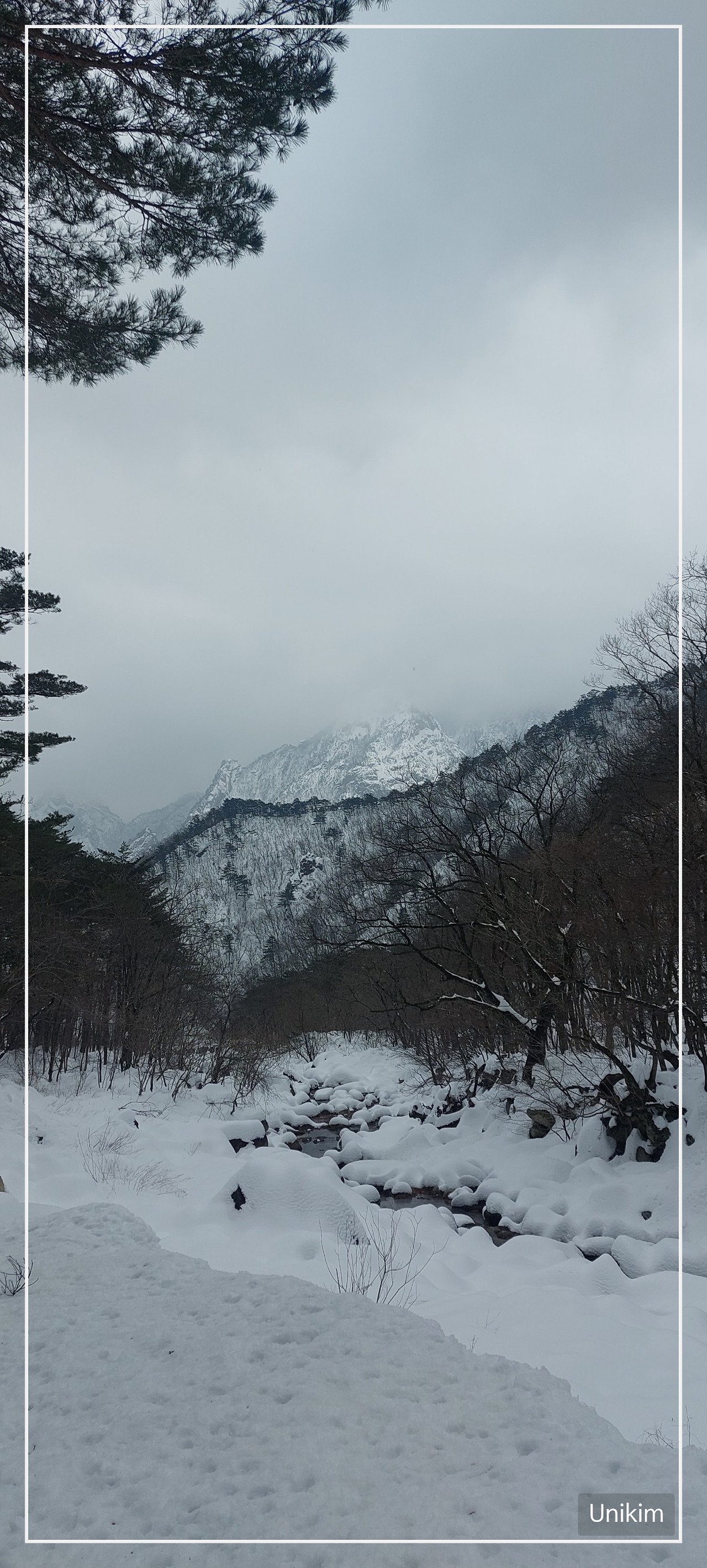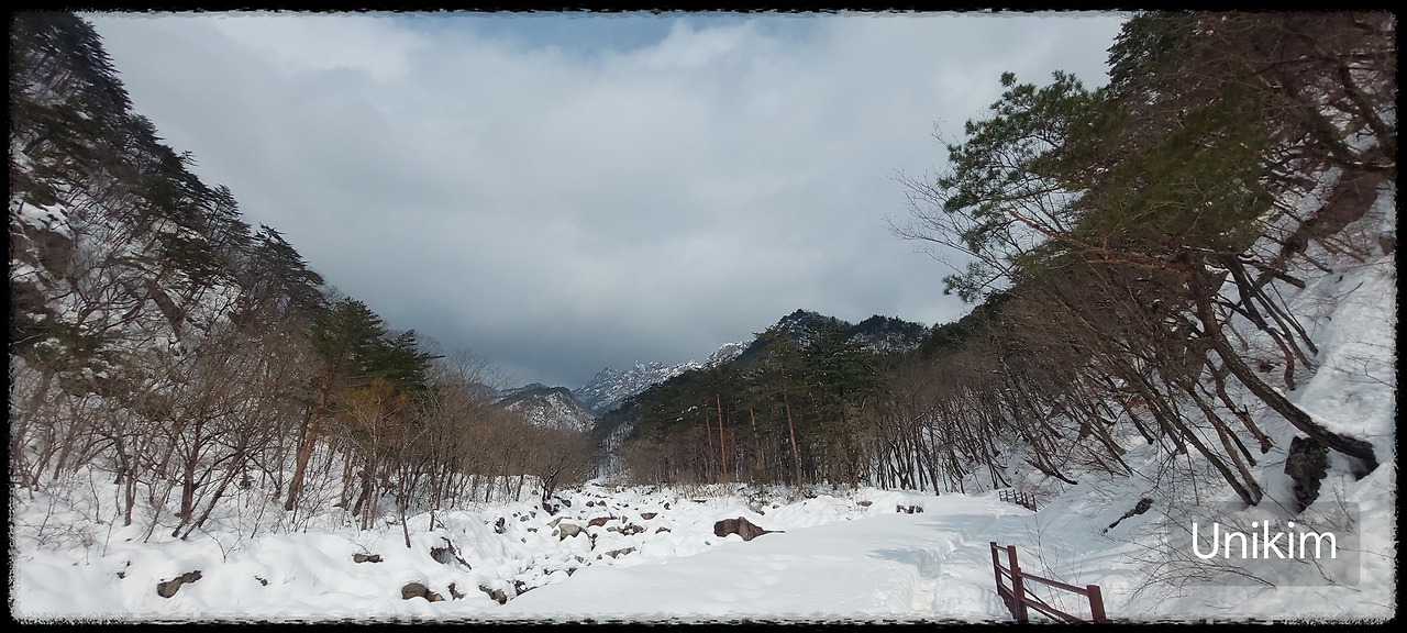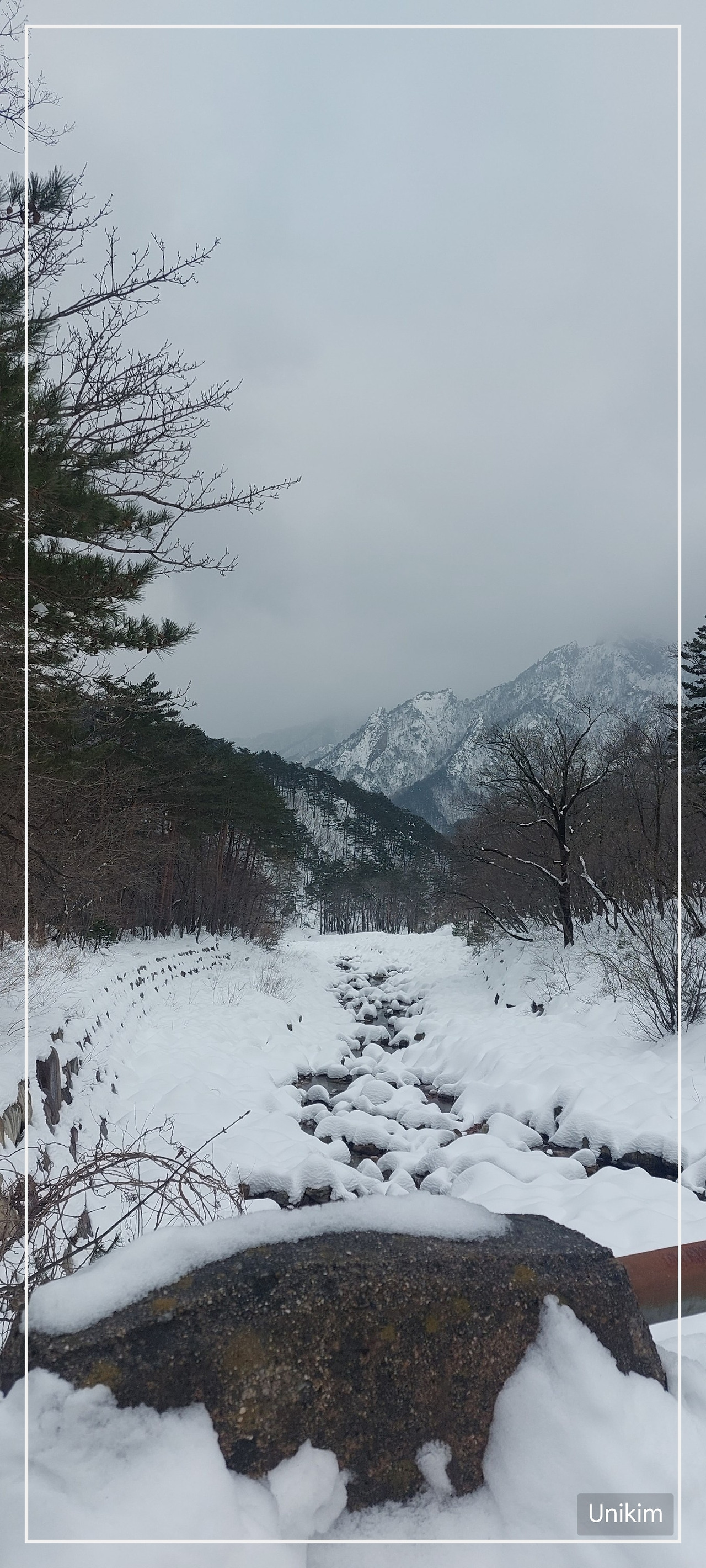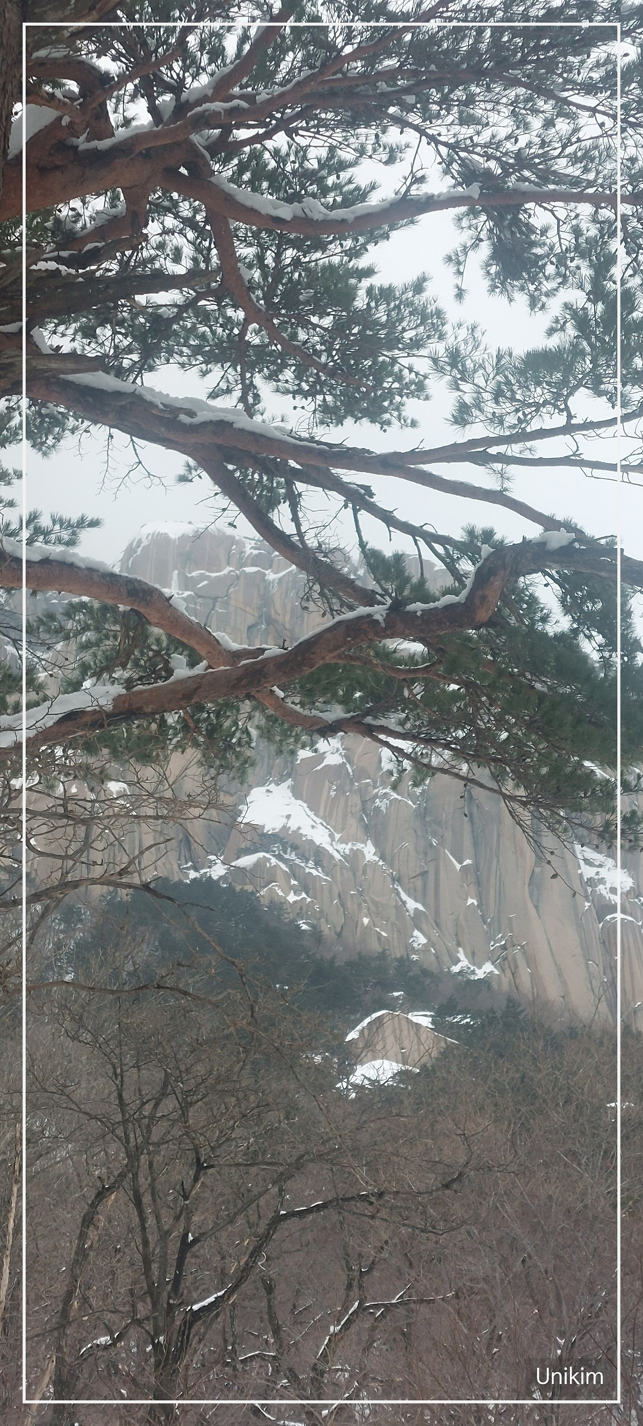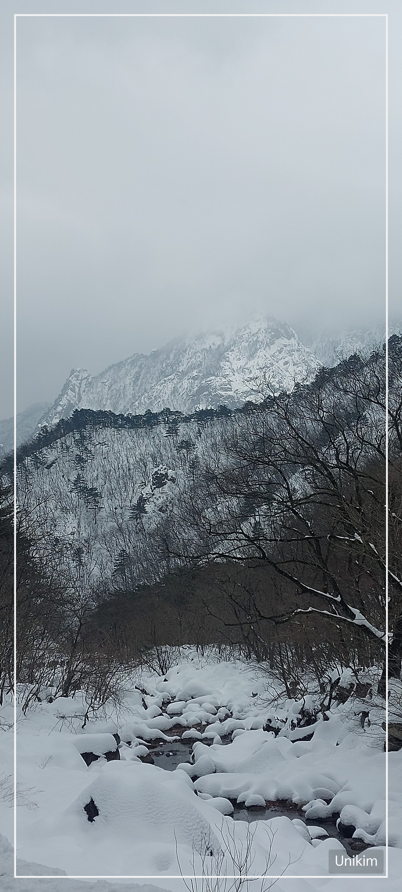 기암절벽과 눈부신 설경 그리고 바람에 나부끼는 나무들까지.... 오를수록 새로운 풍경이 펼쳐지고 그 아름다움은 끝없이 이어지는 것만 같았다. 이곳에 이르러 서보니 아까 차에서 본 풍경과는 또 다른 강동이 밀려들었다.