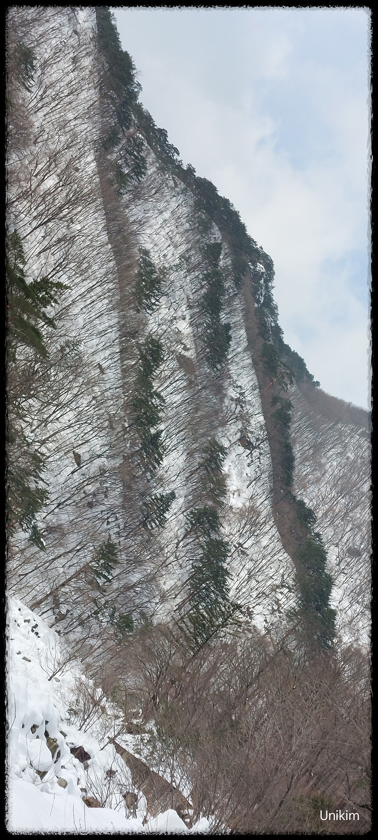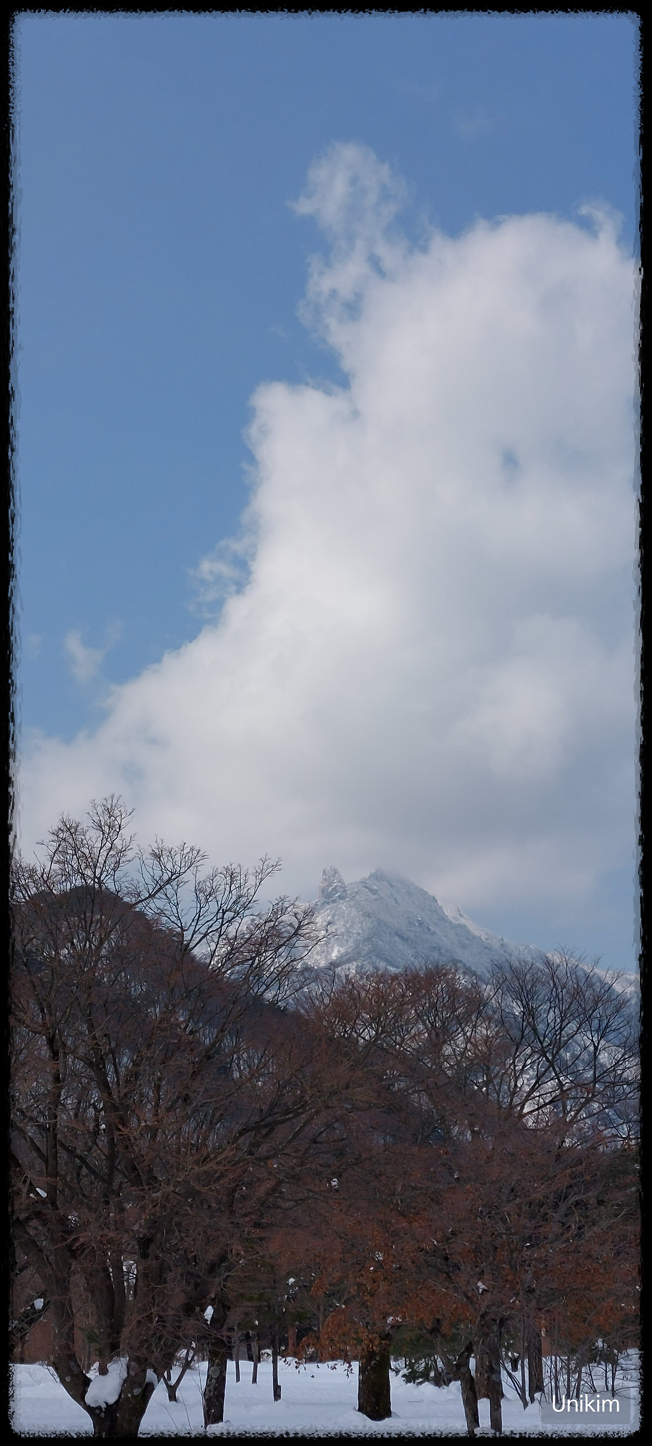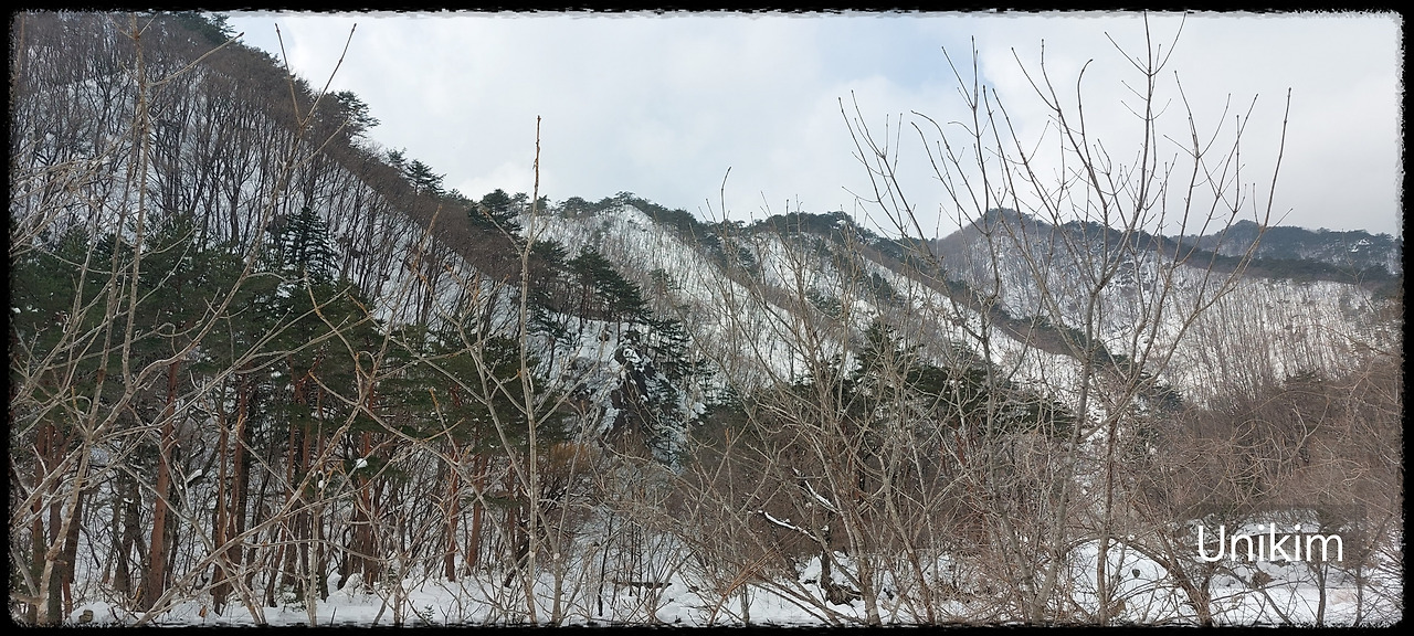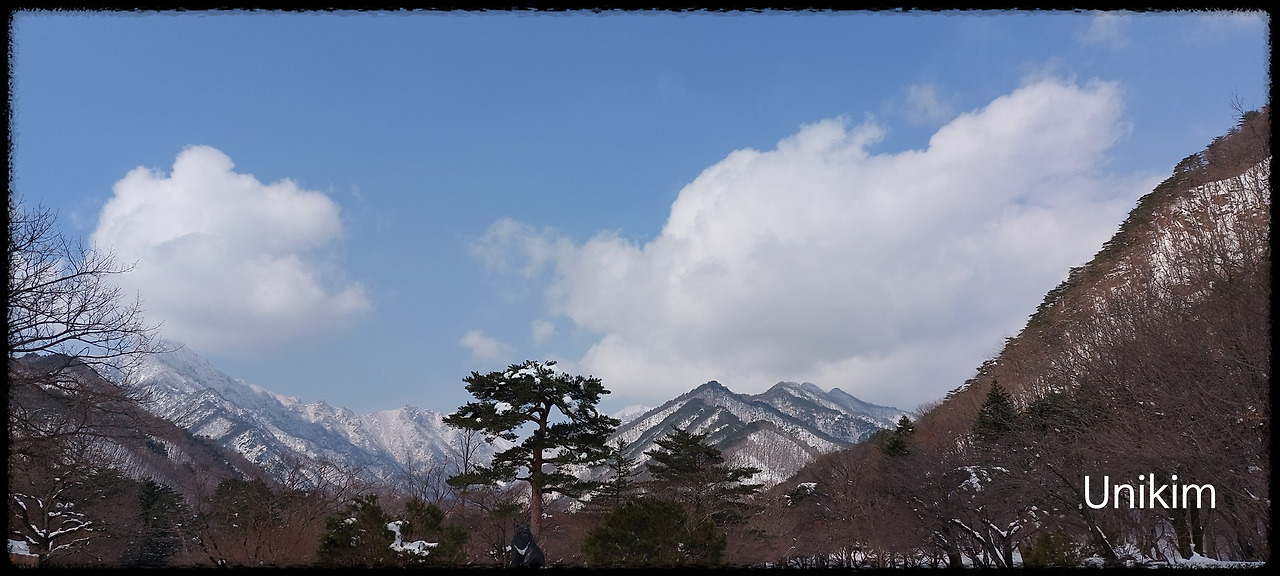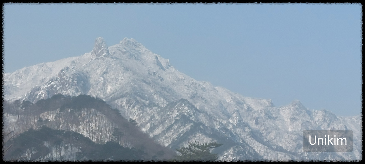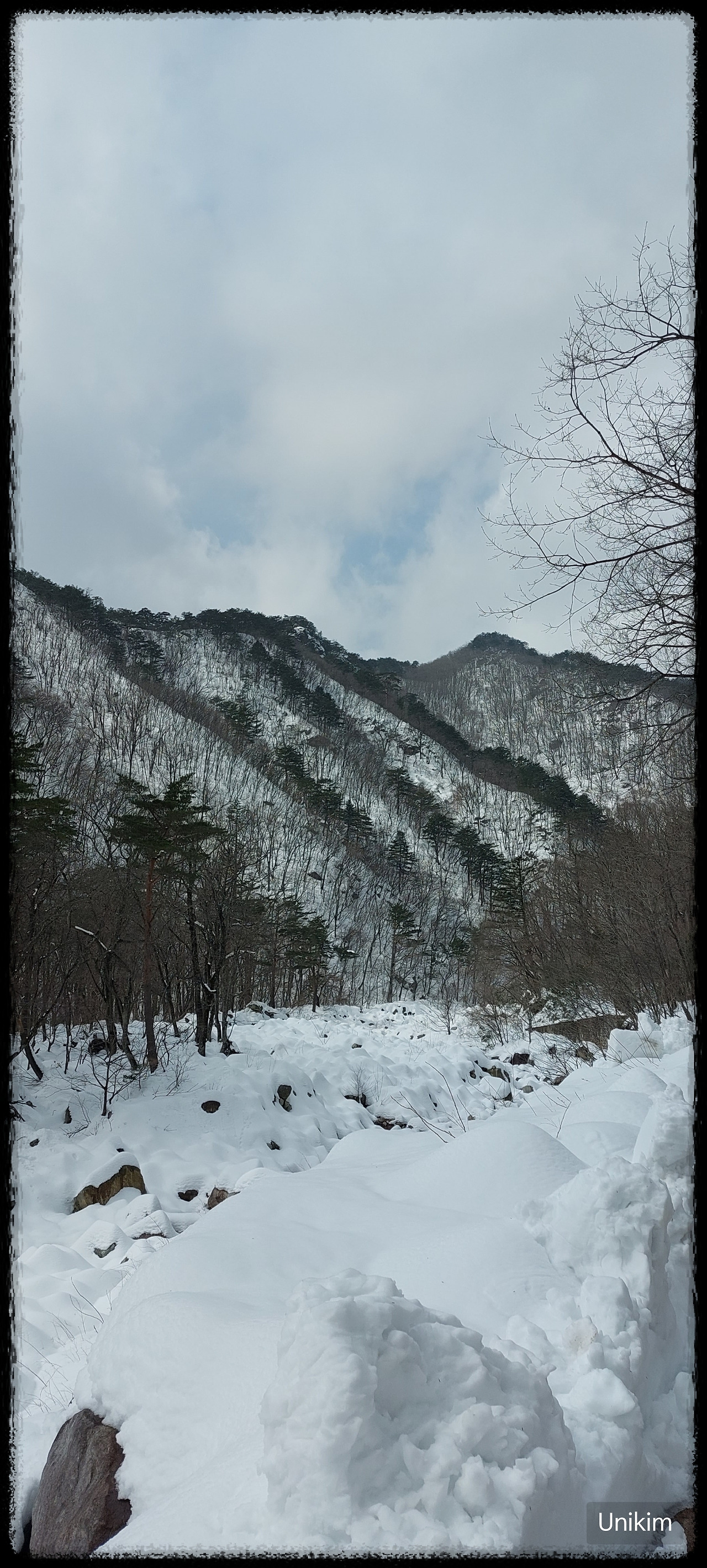 기암절벽과 눈부신 설경 그리고 바람에 나부끼는 나무들까지.... 오를수록 새로운 풍경이 펼쳐지고 그 아름다움은 끝없이 이어지는 것만 같았다. 이곳에 이르러 서보니 아까 차에서 본 풍경과는 또 다른 강동이 밀려들었다.