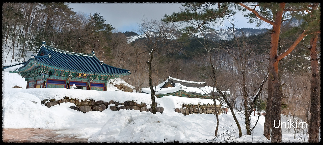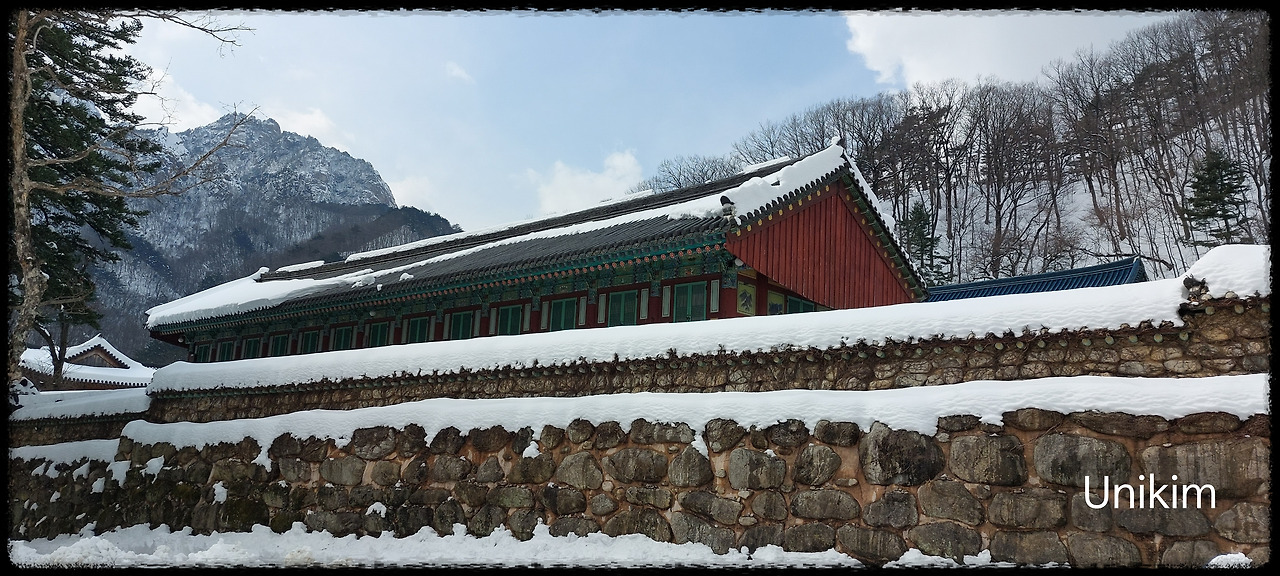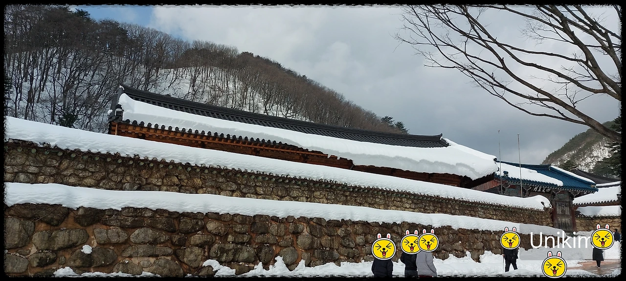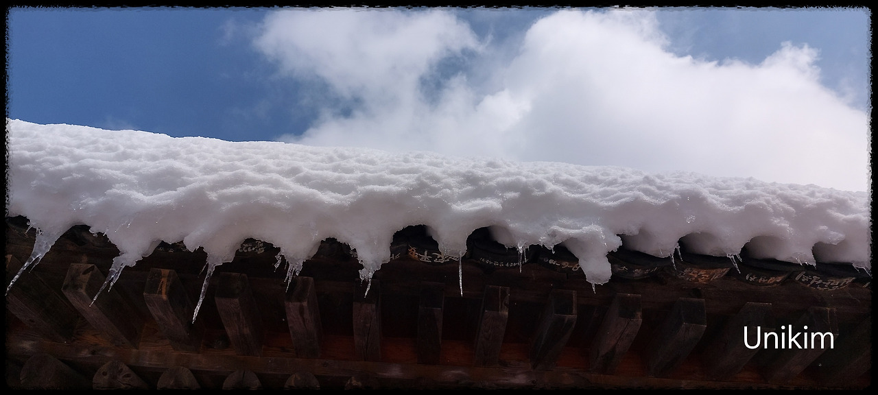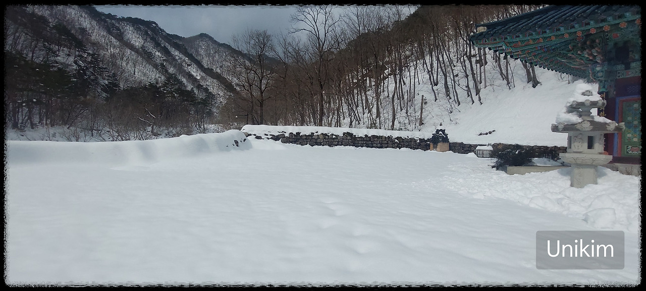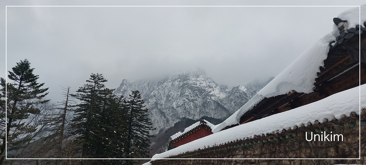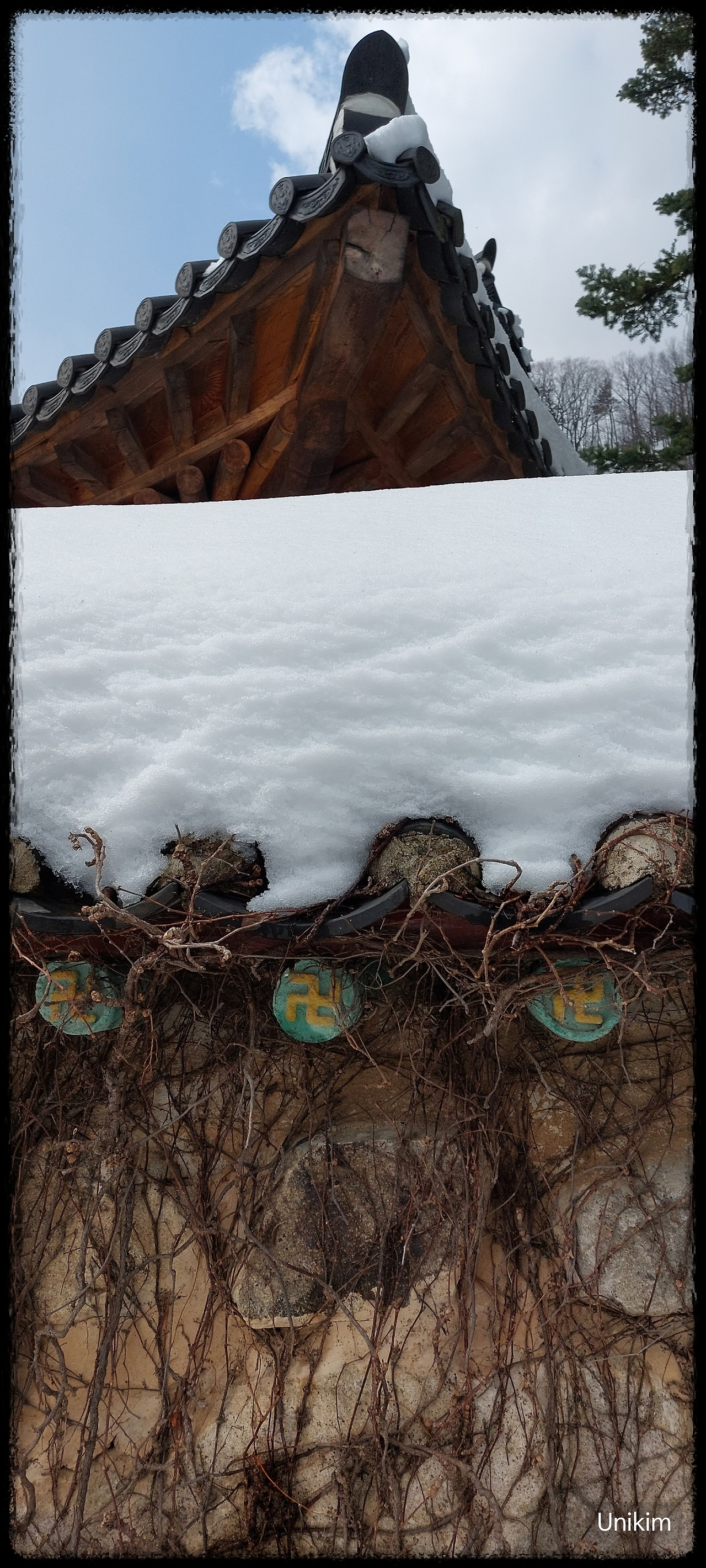 전각을 둘러싸고 있는 돌담이 너무 운치 있어 보여서 사진으로 담았다. 소복이 눈이 내려앉은 전각 그리고 그를 감싸듯 자리한 돌담은 마치 오랜 세월을 품은 듯 그 풍경은 깊은 침묵 속에서도 말없이 이야기를 건네고 있었다. 희끗한 설경 위로 단청이 전각의 단청이 은은하게 빛나고 돌담은 세월의 곁을 따라 부드럽게 이어져 고요한 조화를 이루었다.