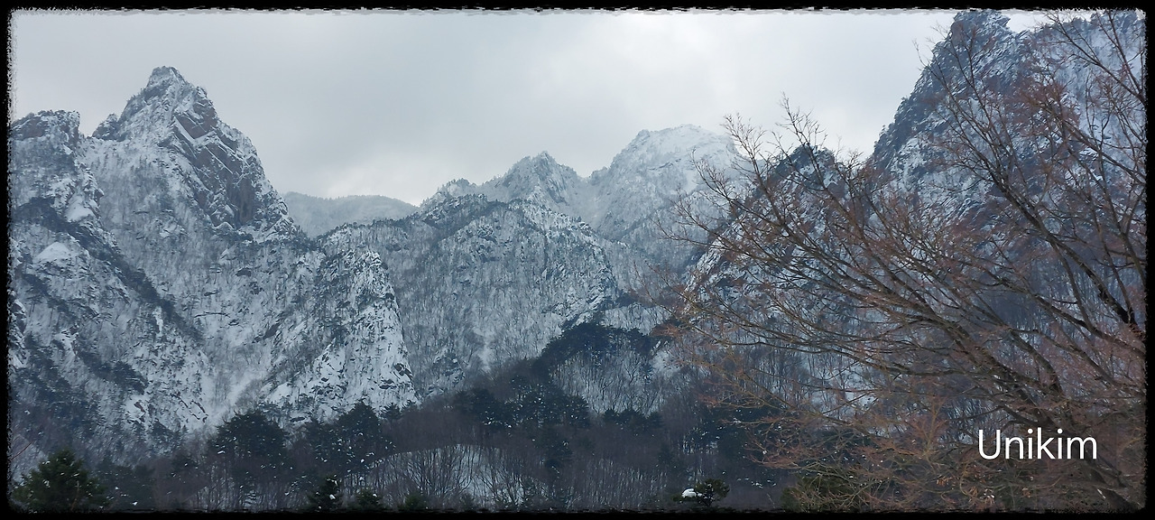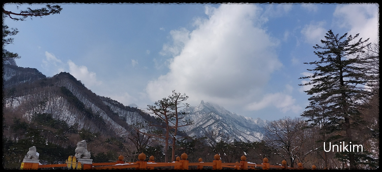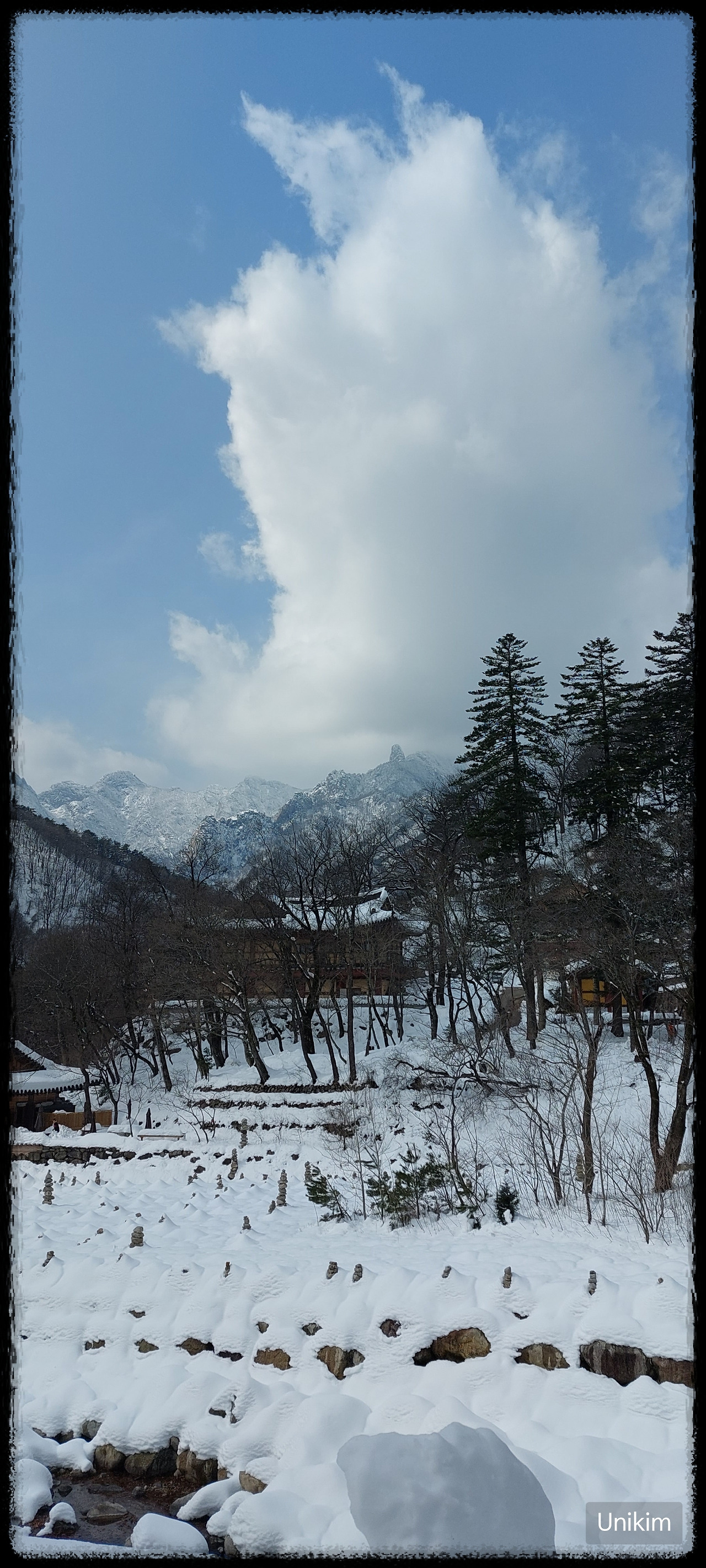 이곳에 오는 길에 우린 눈이 덮인 산을 보았더랬다. 감탄에 감탄을 하며 왔는데 이곳에 와서 보니 그 모든 감탄이 무색할 만큼 경치가 아름다웠다. 하늘 높이 솟은 바위 능선과 눈부신 설경이 눈앞에 펼쳐지고 차가운 공기마저 신비로움을 담고 있는 듯했다.