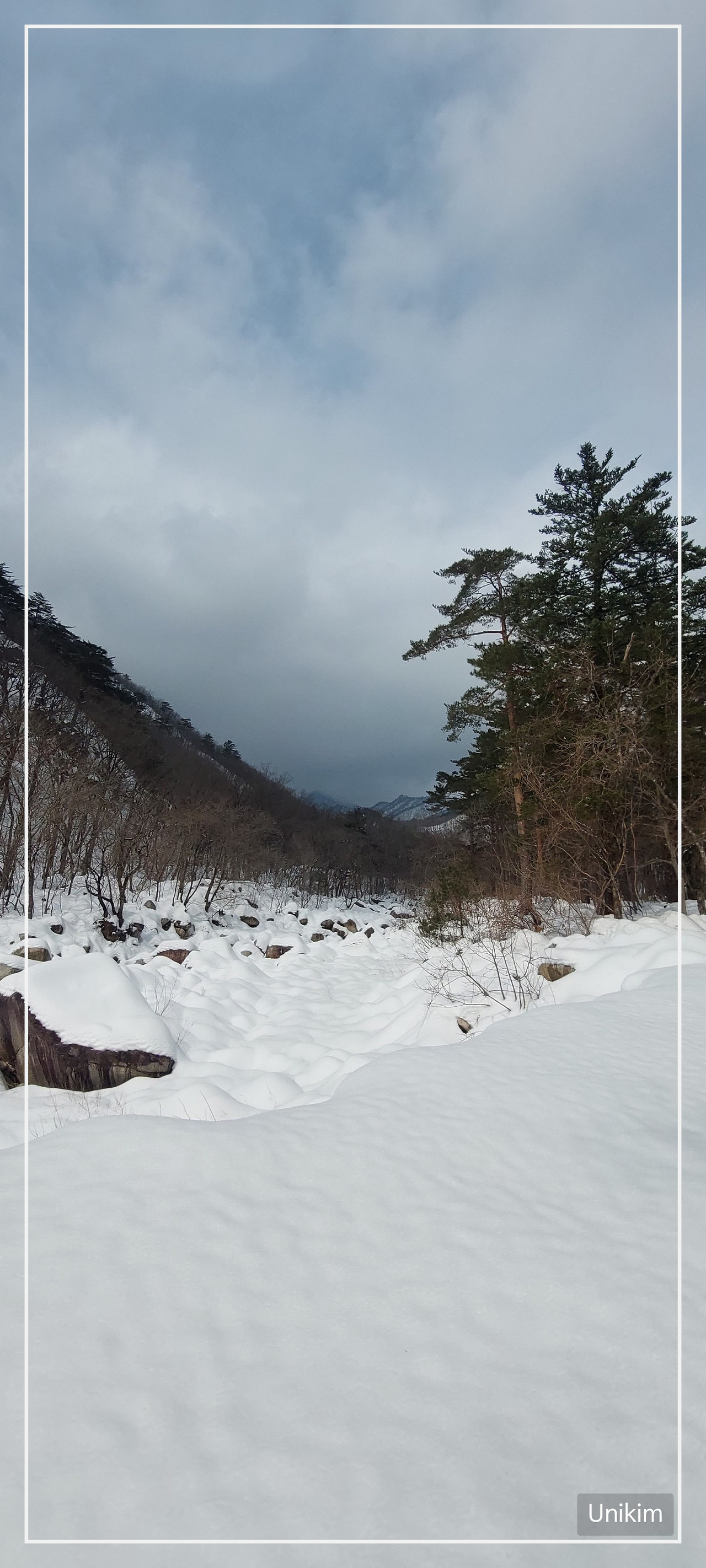 계곡도 눈 덮인 산도 운치 있는 나무들도 다정한 우리의 친구가 되어 주었다.