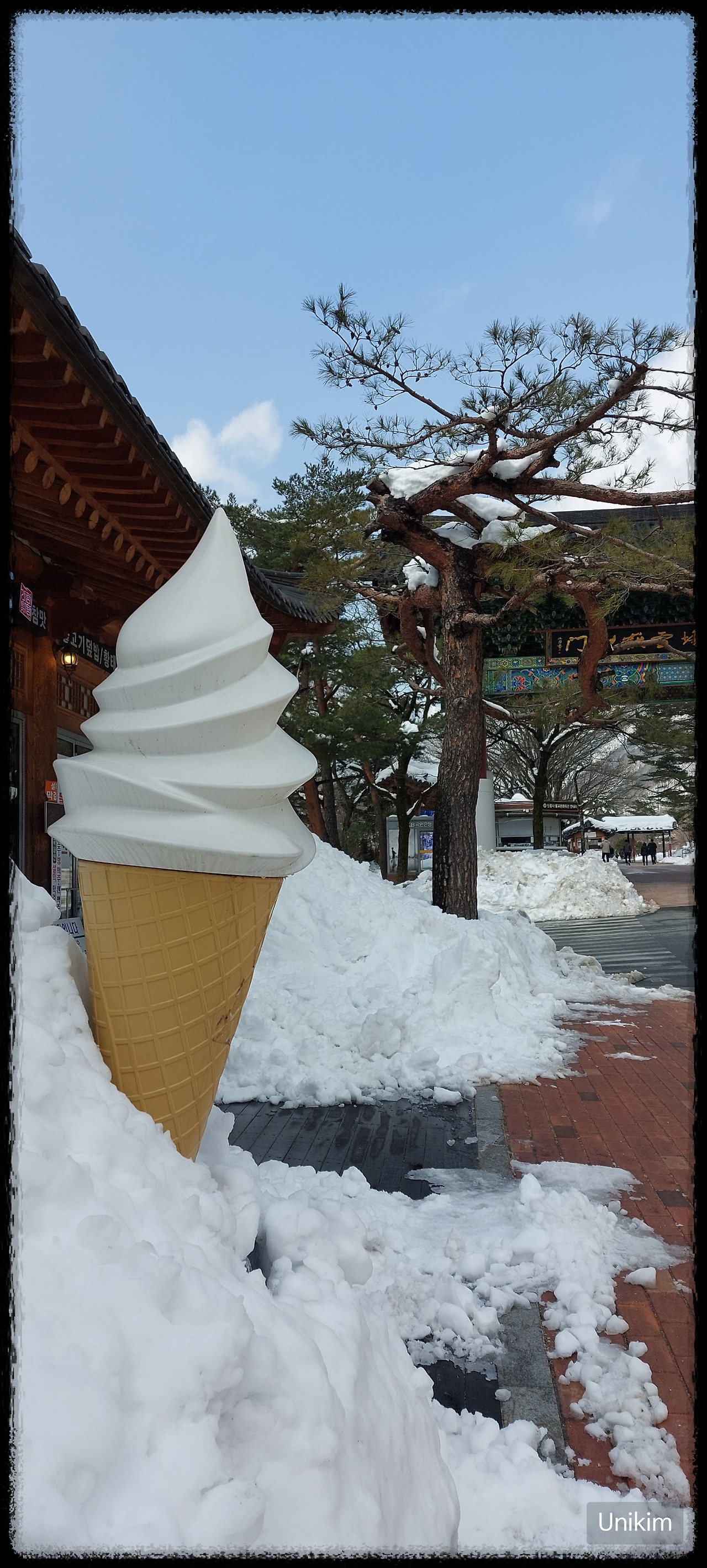 설악산엔 꿀 아이스크림이 유명하다고 한다. 수북이 쌓인 눈 위에 우뚝 서 있는 콘 아이스크림의 모형이 인상적이어서 살짝 담아 보았다. 하지만 아침시간인지라 아이스크림을 사서 먹지는 않았다. 대신 목표지에 올랐다가 하행길에 맛난 아이스크림은 먹기로 했다.