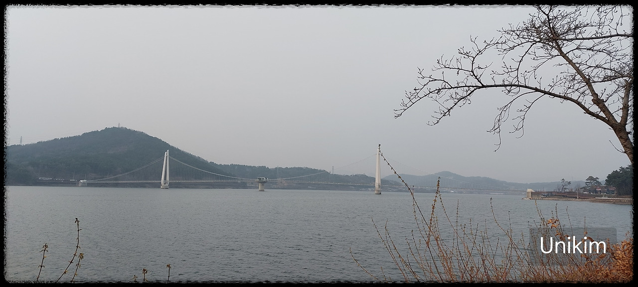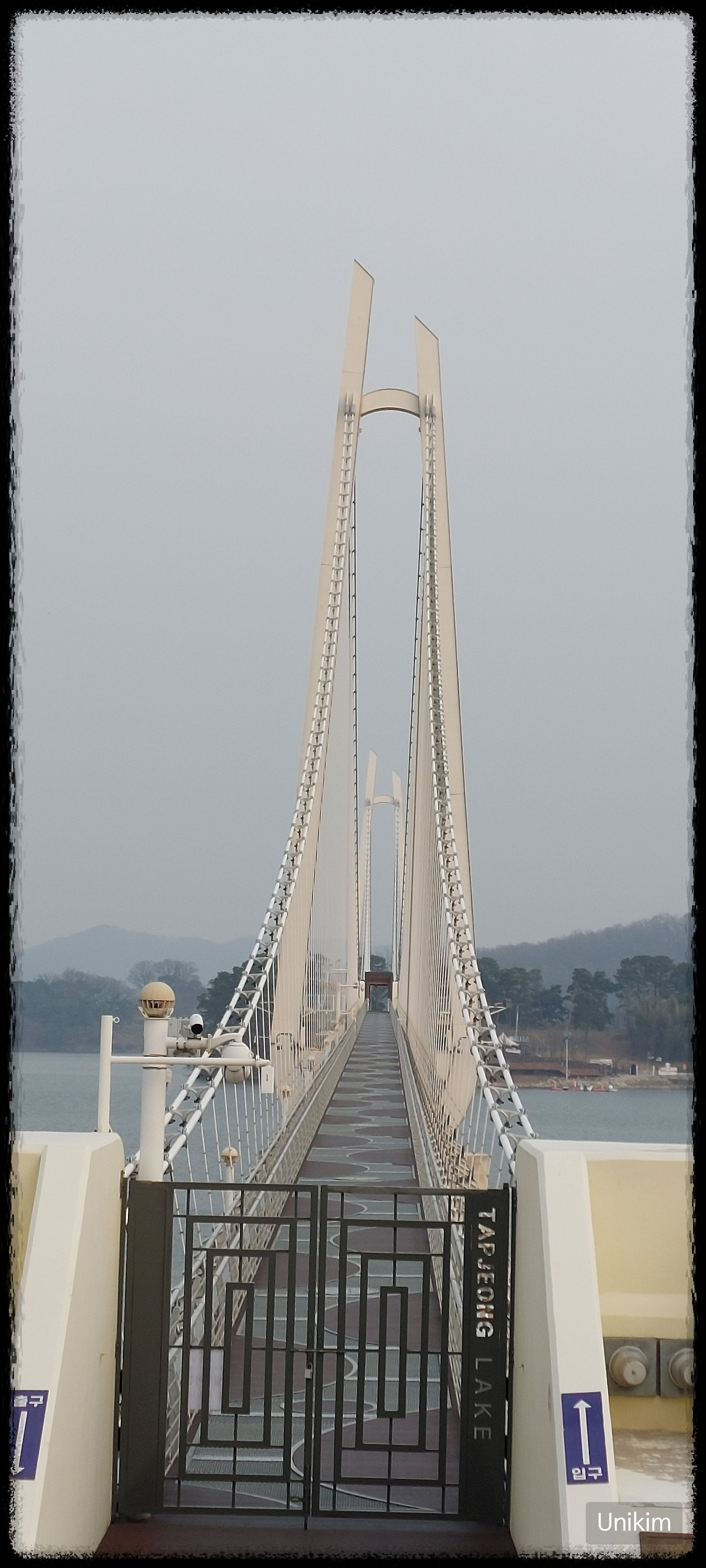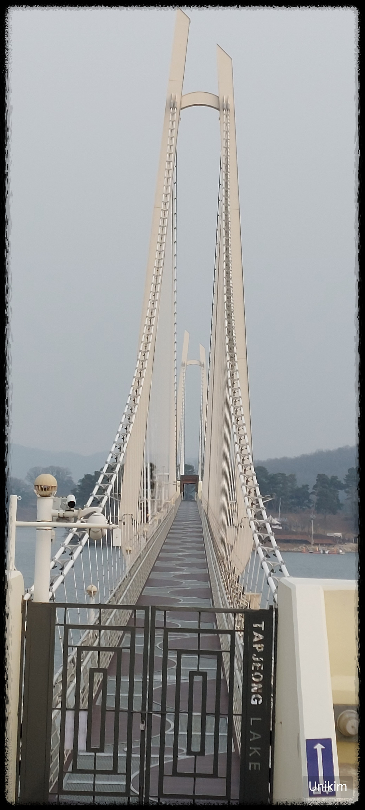 그다음은 출렁다리를 보러 이동했다. 차를 북문주차장에 세우고 걸어 올라가니 길고 웅장한 다리가 모습을 드러냈다. 시간 관계상 다리를 직접 건너보진 못했지만, 멀리서 바라보는 것만으로도 그 압도적인 스케일을 느낄 수 있었다. 호수를 가로지르는 다리는 마치 두 세계를 연결하는 듯했고, 그 곁에서 부는 바람은 여행자의 마음을 설레게 했다.