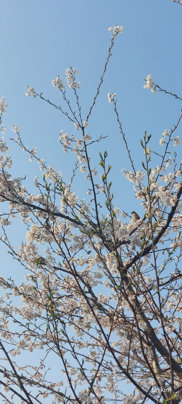 그 새는 벚꽃 잎 사이를 이리저리 옮겨 다니며 무언가를 열심히 먹고 있었다.