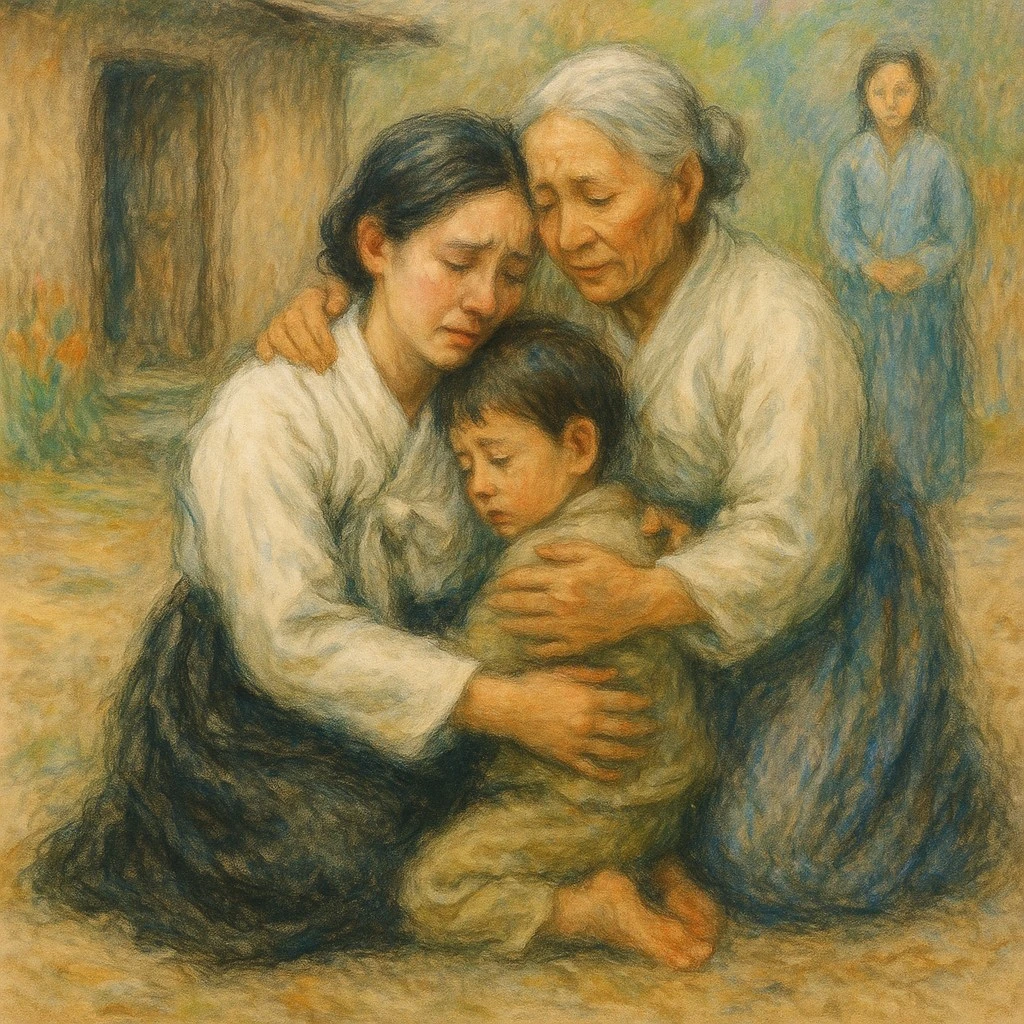 순이는 눈치를 보고 있는 춘식을 향해 손을 내밀었다. 엄마의 손짓에 춘식은 엄마에게 달려갔다.