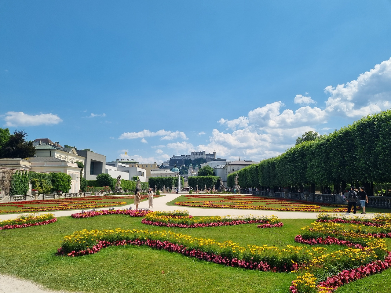 이제 본격적으로 잘츠부르크를 돌아보기로 한다. 처음 간 곳은 영화 사운드 오브 뮤직에 나오는 미라벨 정원과 대저택. 1600년 볼프 디트리히 대주교가 사랑하는 여인 살로메 알트를 위해 지은 곳이란다. 자식도 여럿 낳았다니 성직자로 그럴 수 있었다는 것이 믿어지지 않는다. 옆에는 모차르트 음악대학원이 보이고 구시가지 쪽으로 좀 더 가니 모차르트가 17년 동안 살았다는 핑크색 건물의 모차르트 하우스가 보인다. 구시가지 거리 양쪽으로 4-5층은 돼 보이는 예쁜 건물들이 다닥다닥 붙어 있다. 거리 건물은 작은 창문들이 나 있는데 창문 크기에 따라 세금을 물어 작게 만들었다고 한다. 건물들이 다 어둠침침한 게 이유가 있었다. 거리 한쪽 끝은 높은 절벽 위에 수로가 있는데 물을 쏟아내면 비탈길을 통해 강 쪽으로 무엇이든 휩쓸고 내려간다고 한다. 화장실이 없었을 중세 시대에 기가 막힌 오물 처리 시스템이란다.
