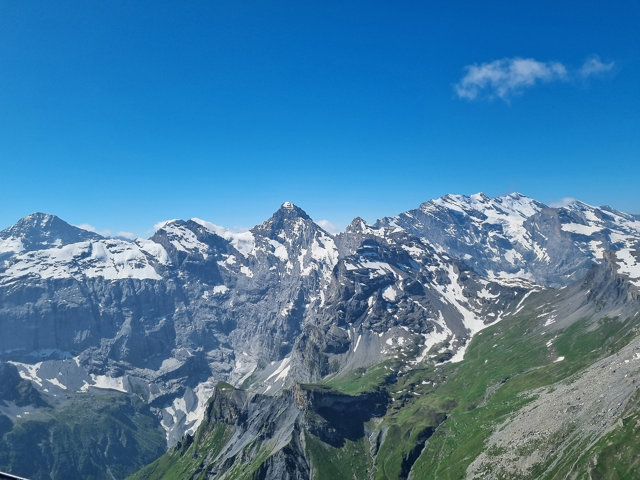 나는 지금 알프스의 아이거, 묀히, 융프라우 삼 형제를 한눈에 보는 쉴트호른에 와 있다. 보기만 해도 거칠다. 산사람들이 왜 산을 좋아하는지 조금 이해하게 된다. 매서운 바람과 거친 절벽을 거스르고 정상에 오른 그 순간은 등산가 스스로 신이 된 착각에 빠질 수도 있겠다는 생각이 든다. 발아래쪽 산에서는 패러글라이더가 날아다닌다. 1000m, 2000m 산이 부지기수다. 몰려오는 구름도 발아래 깔린다. 스위스제 화이트와인 한잔 꼭 마셔야 하는 곳이다. 알코올에, 산소가 부족한지 좀 어지럽다. 이제 케이블카를 타러 내려가야겠다.