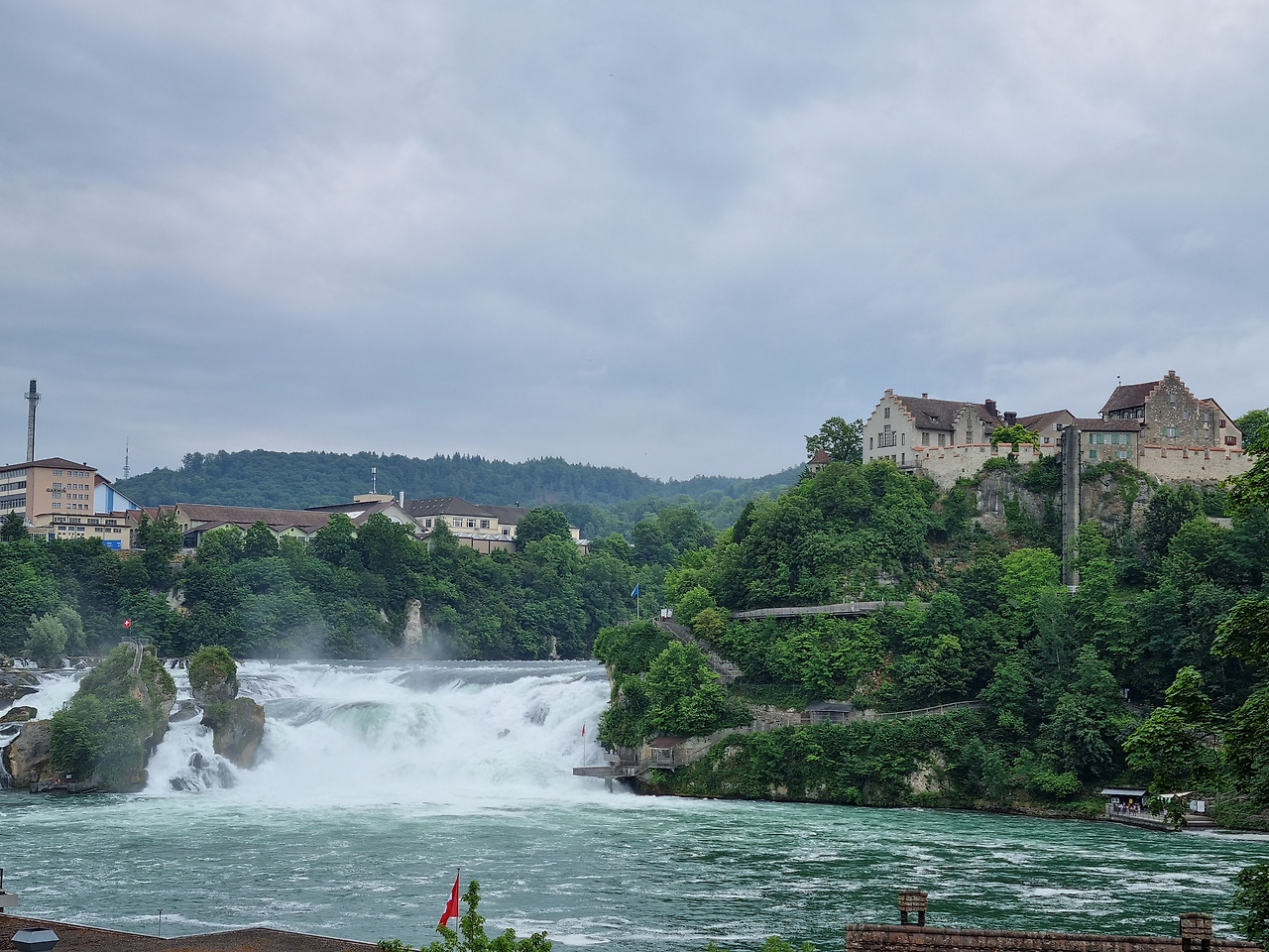 마지막 행선지 라인폭포는 유럽에서는 제일 규모가 큰 폭포란다. 나이아가라나 폭포를 축소해 놓은 것 같다. 우비를 입고 배를 타고 폭포 앞까지 가기도 하고 포인트에서 사진을 찍기도 한다. 하나 다른 점은 작은 성이 있고 그 옆을 기차가 달린다. 운치가 있다. 나들이하기 좋은 날씨여서 관광객도 많다.