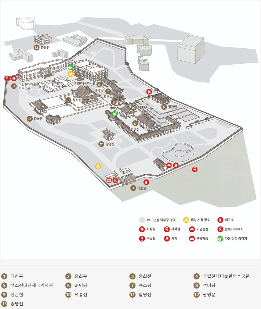 덕수궁의 정문은 원래 정전과 남쪽 일직선상으로 나있던 '인화문'이었다. 지금의 정문은 '대한문'으로 '환구단'이 덕수궁의 동쪽에 마련되면서 '인화문' 대신 동문인 '대안문'을 정문으로 하고 후에 '대한문'으로 이름을 변경한 것이다. 덕수궁은 '즉조당'을 정전으로, '덕홍전'을 편전으로, '함평전'을 침전으로 사용해 왔으나 대한제국 선포 이후 '즉조당'이 제국의 정전으로 쓰기에 너무 협소하여 새롭게 '중화전(中和殿)'과 '중화문'을 세웠다. '중화전'에는 조선의 다른 궁궐과는 달리 대한제국 황제의 상징으로 붉은색 대신 노란색을 칠했는데 쇠퇴해 가는 나라를 다시 세워보려는 고종의 마음을 엿볼 수 있어서 애처롭기까지 했다.