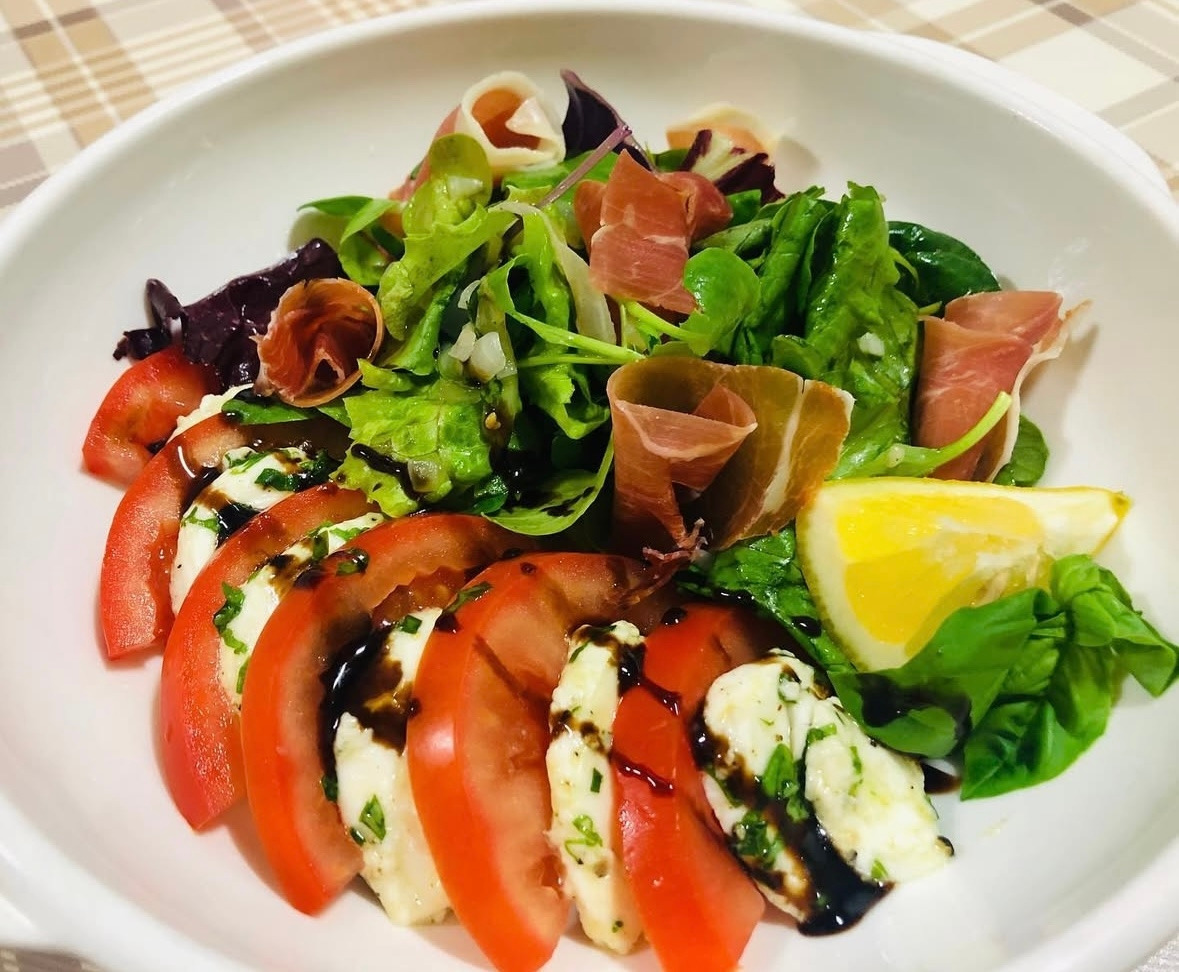 이탈리아의 지중해 음식으로, 신선한 토마토, 고소한 모차렐라 치즈, 향긋한 바질이 어우러져