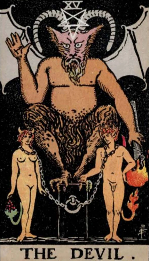 이를 잘 보여주는 타로카드는 15번 악마카드로, 악마(욕망과 탐욕, 집착, 도덕적 타락, 부패권력 등)의 발치에서 목에 쇠사슬이 걸린 채 그 검은 세력에 의존하고 자신의 목(숨)을 내 준 나약한 인간의 모습이다! 그 목걸이는 단순한 외부인들의 선물이나 유혹이 아닌, 그녀 자신이 스스로 자신의 허영심과 욕망에 굴복하는 상태를 상징하며 여기에 권력과 사치가 뒤엉킨 거래라고 볼 수 있겠다.