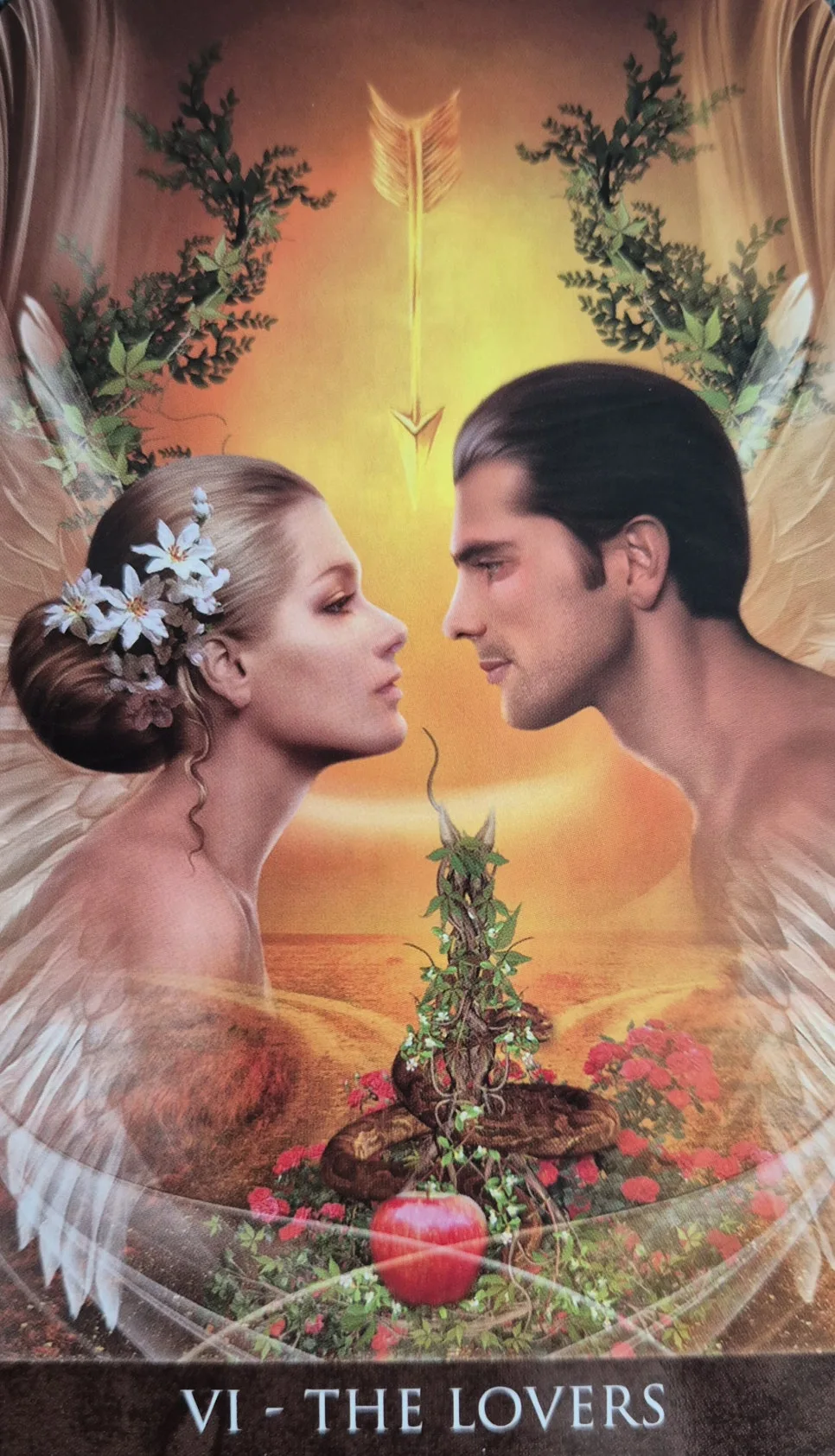 6번 연인카드는 사랑이란, 순간의 매혹을 넘어 서로를 진심으로 마주 보고 선택하여 내 삶의 방향을 결정하는 것이라고 말해 준다. 두 사람 사이에 놓인 사과와 반쯤 몸을 숨긴 뱀은 사랑에는 언제나 유혹, 욕망, 집착 그리고 선택의 갈림길 사이에서 고민함을 포함하고 있다. 그 선택이 내 삶에 어떤 책임(또는 결과)을 가져올지 바라보아야 한다는 것을 의미한다.