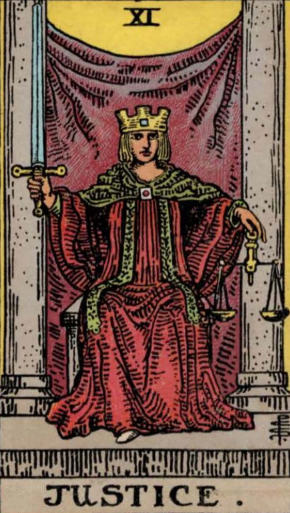 < 유니버셜웨이트 메이저, 11번 정의 카드: 한손에는 검을, 다른손에는 저울을 들고 결단과 공정한 판단을 강조한다. >
