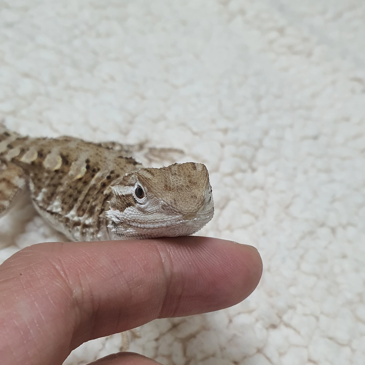 작고 낯선 비늘, 무표정한 얼굴, 조용히 사육장 한편에 자리 잡은 모습.