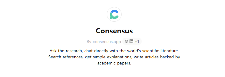 Consensus는 논문을 찾거나 과학적인 근거 기반의 자료가 필요할 때 유용한 GPTs다. 논문을 찾는 목적과 주제 등의 간단한 프롬프트를 입력하기만 해도 관련된 논문의 요약본과 링크를 제공해 주기 때문에 매우 유용하다.