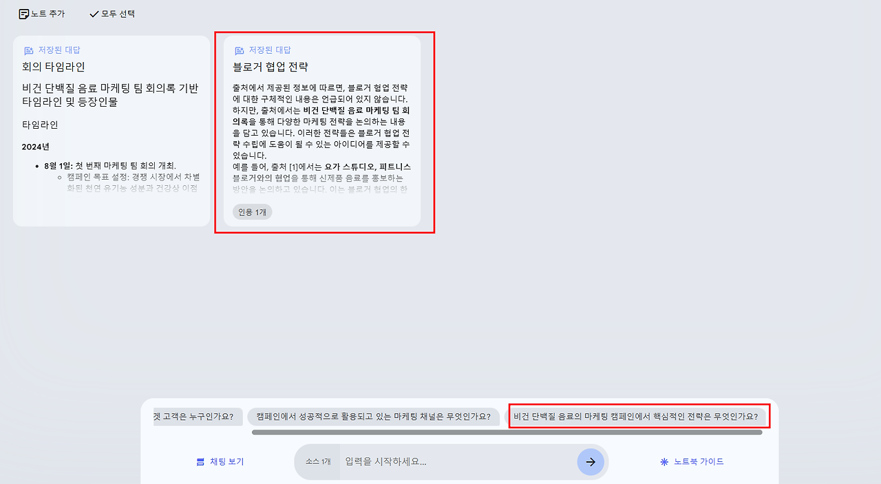 이처럼 사용자가 업로드한 문서를 자동으로 분석하여 주요 정보를 추출할 수 있다는 게 노트북LM의 주요 기능입니다. 더 나아가서 내용에 대한 질문과 답변을 통해서 필요에 따라 추가적으로 아이디어를 디벨롭해 나갈 수 있습니다.