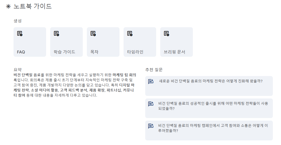 별도의 문서 가공이나 작업 없이도 회의록을 업로드하면, "마케팅 팀 회의에서 가장 많은 관심을 받았던 마케팅 전략", "기존 마케팅 전략에서 고객 반응을 가장 많이 이끌어낸 전략" 등 업로드된 내용을 바탕으로 한 질문이 바로 도출되는데요. 이처럼 노트북LM은 내가 업로드한 문서의 성질을 정확히 이해하고 그에 맞는 관련 질문과 주제를 제시해주기 때문에 아이디어를 확장하는 데 아주 유용합니다.